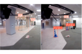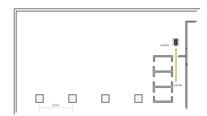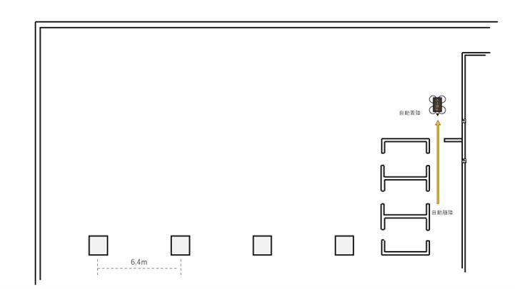 - 3. ドローン離陸、幅2メートルの通路を飛行後ドア開口部90センチメートルの狭小空間を通過。