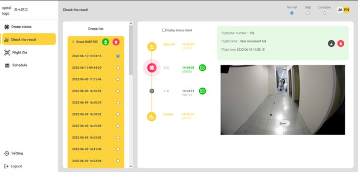 - 2.1の飛行後、MFAトラッカーから飛行経路の設定を変更し、マーカーを追加。自動充電ポートからドローン離陸、マーカーを読み変更されたルートを正しく一周し充電ポートに戻り自動充電に成功、画像と動画を転送。