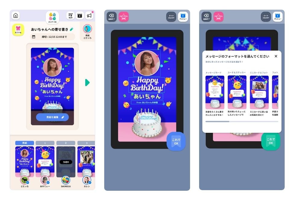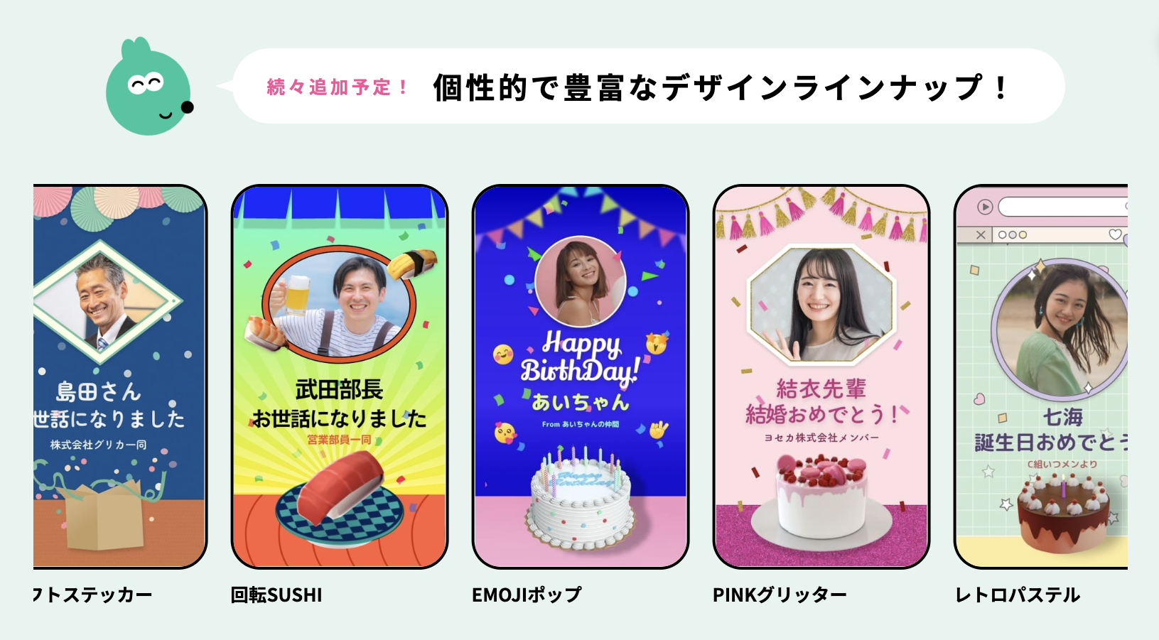本来メッセージを誰かに贈る時は、ビデオメッセージでもボイスメッセージでも似顔絵でもいいはずですが、寄せ書きというフォーマットになると、決められた枠の中にしか気持ちを込められないことがほとんどで、うまく伝えられないと感じた経験はありませんか?ヨセカとグリカでは、9種のフォーマットの中から好きなメッセージの方法を選ぶことができ、テキストや写真はもちろん、ボイス・動画に至るまで、さまざまなフォーマットから、自分に合ったぴったりの方法で、相手へのメッセージを作ることができます。