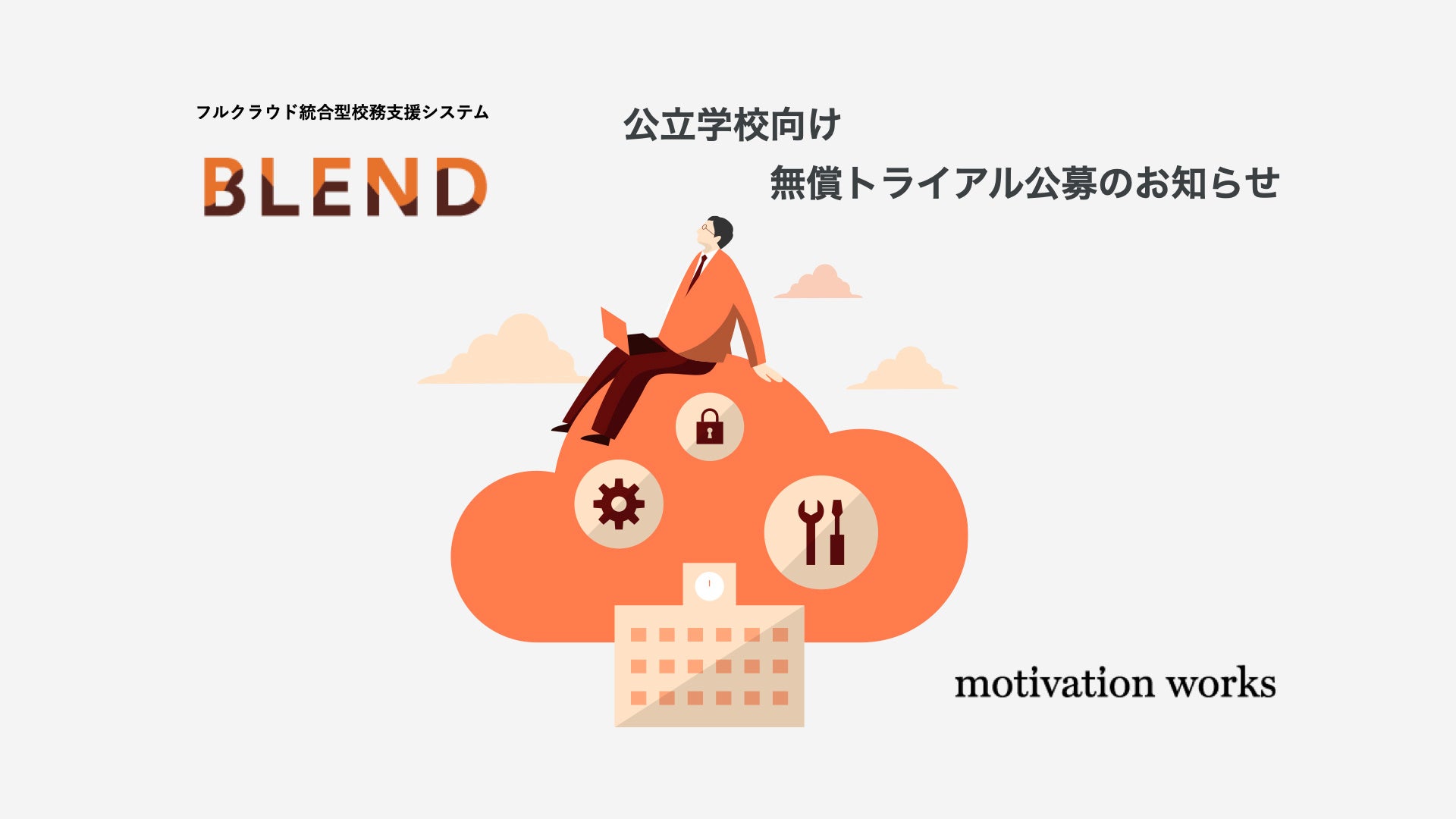 フルクラウド統合型校務支援システム「BLEND(ブレンド)」(https://blend.school/)を展開するモチベーションワークス株式会社(本社:東京都新宿区、代表取締役:一ノ倉 悠)は、校務支援システムの導入をご検討中の公立学校向けに、2023年3月31日までの期間「BLEND」を無償でご利用いただける「無償トライアル」キャンペーンを実施いたします。