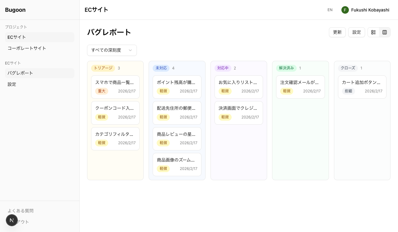 Bugoonでは、すべてのバグレポートを5段階のステータス(Triage → Open → In Progress → Resolved → Closed)で管理。報告の受付から修正完了まで、ダッシュボード上で一元的に追跡できます。