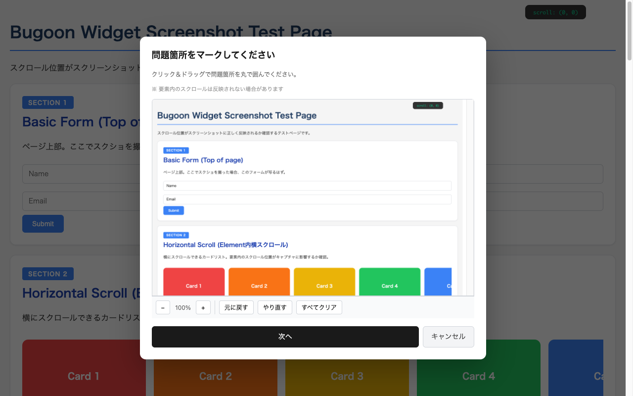 サイトに表示されるウィジェットボタンをクリックするだけで、ページ全体をキャプチャ。丸印で問題箇所をハイライトできます。専用のChrome拡張機能を使えば、ピクセルパーフェクトなスクリーンショット撮影も可能です。