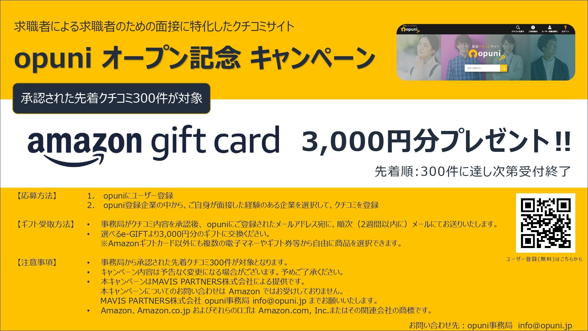 opuniオープン記念キャンペーン!クチコミ登録 先着300件に Amazonギフトカード3,000円分プレゼント!