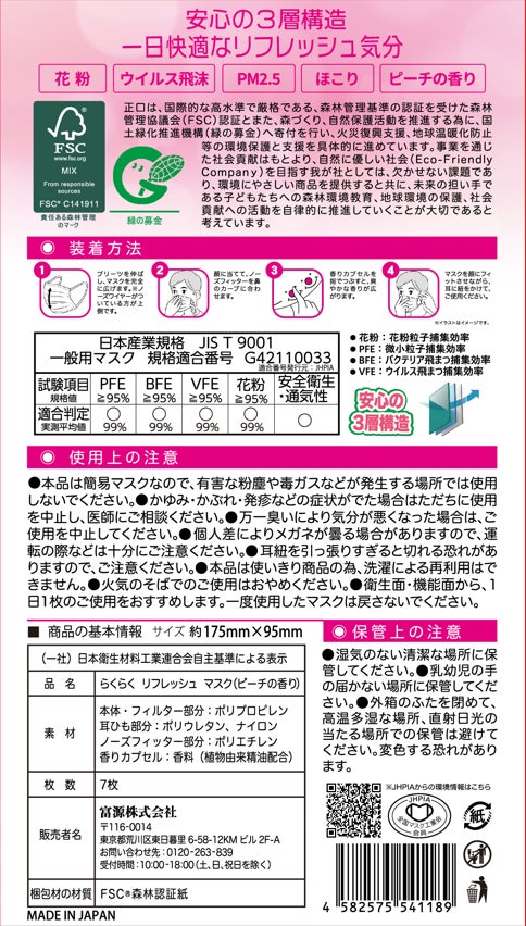 富源株式会社(本社:東京都荒川区、代表取締役社長:吉川 真樹)の自社ブランド<正口>から発売中の「らくらくリフレッシュマスク」(5+2枚入り各種・日本製) がJIS適合審査に合格しました。