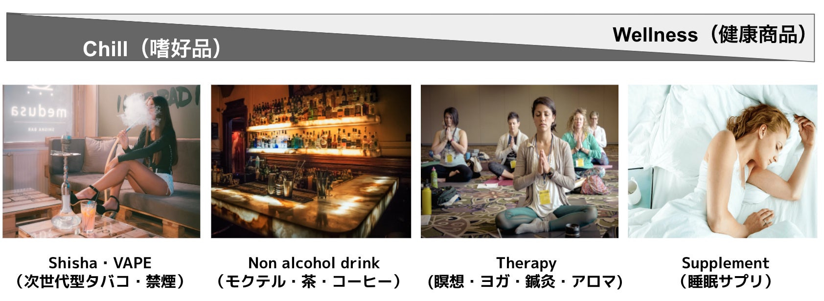 CBDの認知度が拡大する中、商品ブランドは増え続けており、様々な分野で活用されています。相性の良い市場は大きく分けるとChill(嗜好品)市場とWellness(健康商品)市場の2つです。