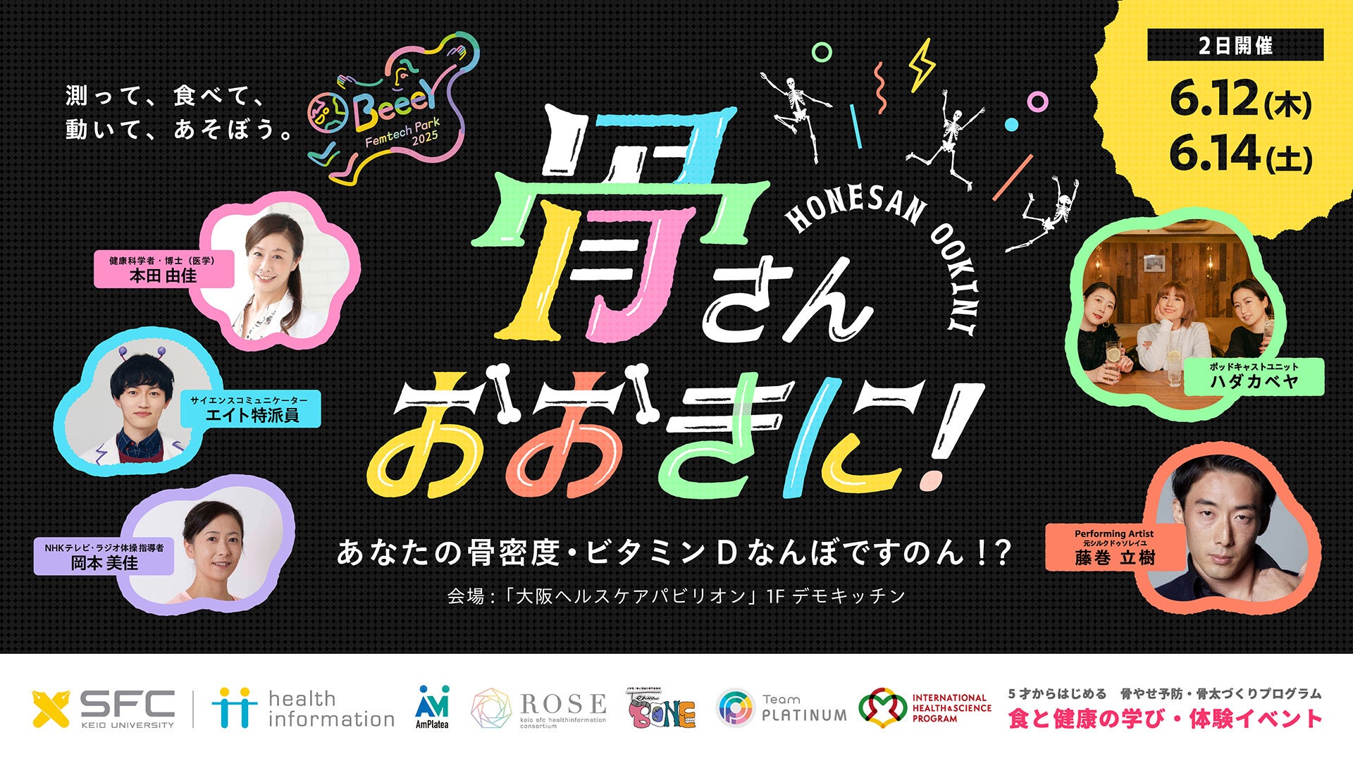 今回の期間限定イベントは、「BeeeY Femtech Park2025 プロジェクトツアー」の第1弾テーマとして「骨さん、おおきに!」として、骨の健康を主題に取り扱ってまいります。 大阪ヘルスケアパビリオン「大阪の豊かな文化と日本のヘルスケア×テクノロジーを融合したソサエティ5.0」のテーマを踏襲し、骨と健康をさまざまな角度から考える体験型イベントとして企画されました。企画に際しては、日本抗加齢医学学会」/「日本抗加齢協会」のご協力のもと、慶應義塾大学SFC研究所 健康情報コンソーシアムに所属の健康科学、情報科学、医学、サイエンス、アート、エンターテイメント等の専門家らを中心に企画し、ご賛同・ご協力いただける医療機関、民間企業、エンジニア、インフルエンサーなど多くの方々のご支援・ご協力を得て、実現することができました。