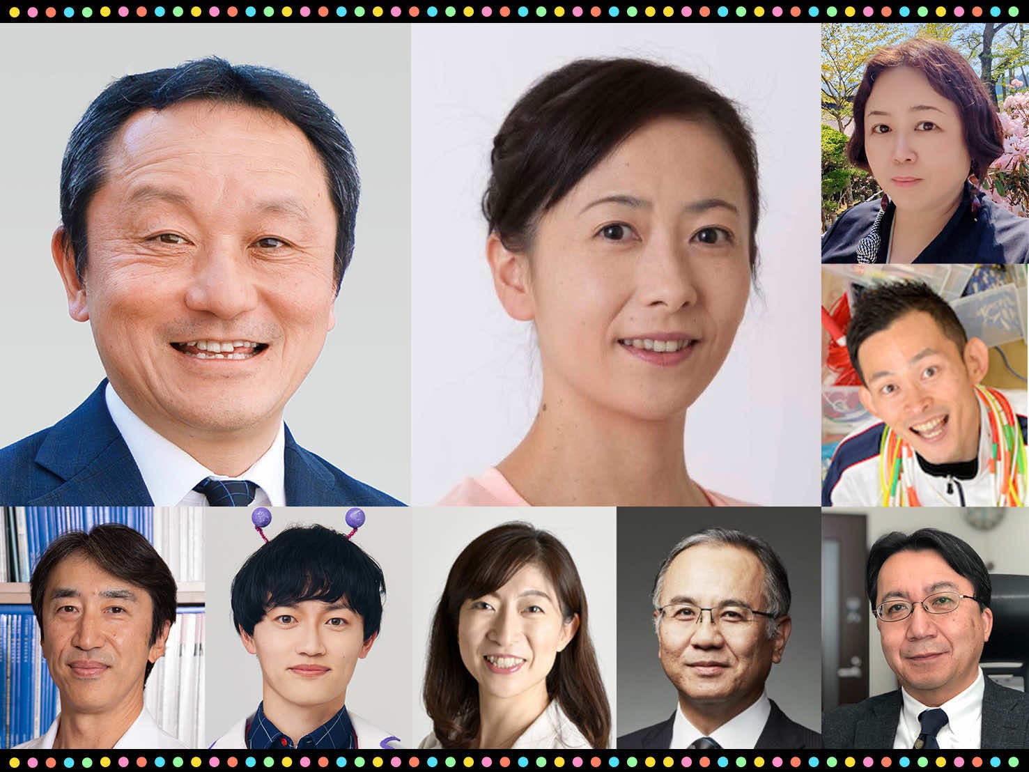 左中段から:漆畑 文哉(科学コミュニケーター)、杉山 丈太郎(慶應義塾大学 環境情報学部3年)、永田 美香(アスレティックトレーナー/ATC)、大田 えりか(聖路加国際大学大学院 看護学研究科 国際看護学 教授.)、おかもん /岡本 悠(なわとび専門店OK ROPE 代表 ) 左下から:本田 由佳(本イベント総合プロデューサー/慶應義塾大学大学院 制作・メディア研究科 特任准教授)、片山 晋(国立大学法人東海国立大学機構 名古屋大学 未来社会創造機構 モビリティ社会研究所 特任助教)、米澤 拓郎(国立大学法人東海国立大学機構 名古屋大学大学院 工学研究科 准教授)、中澤 仁(本イベント代表/慶應義塾大学 環境情報学部 教授)