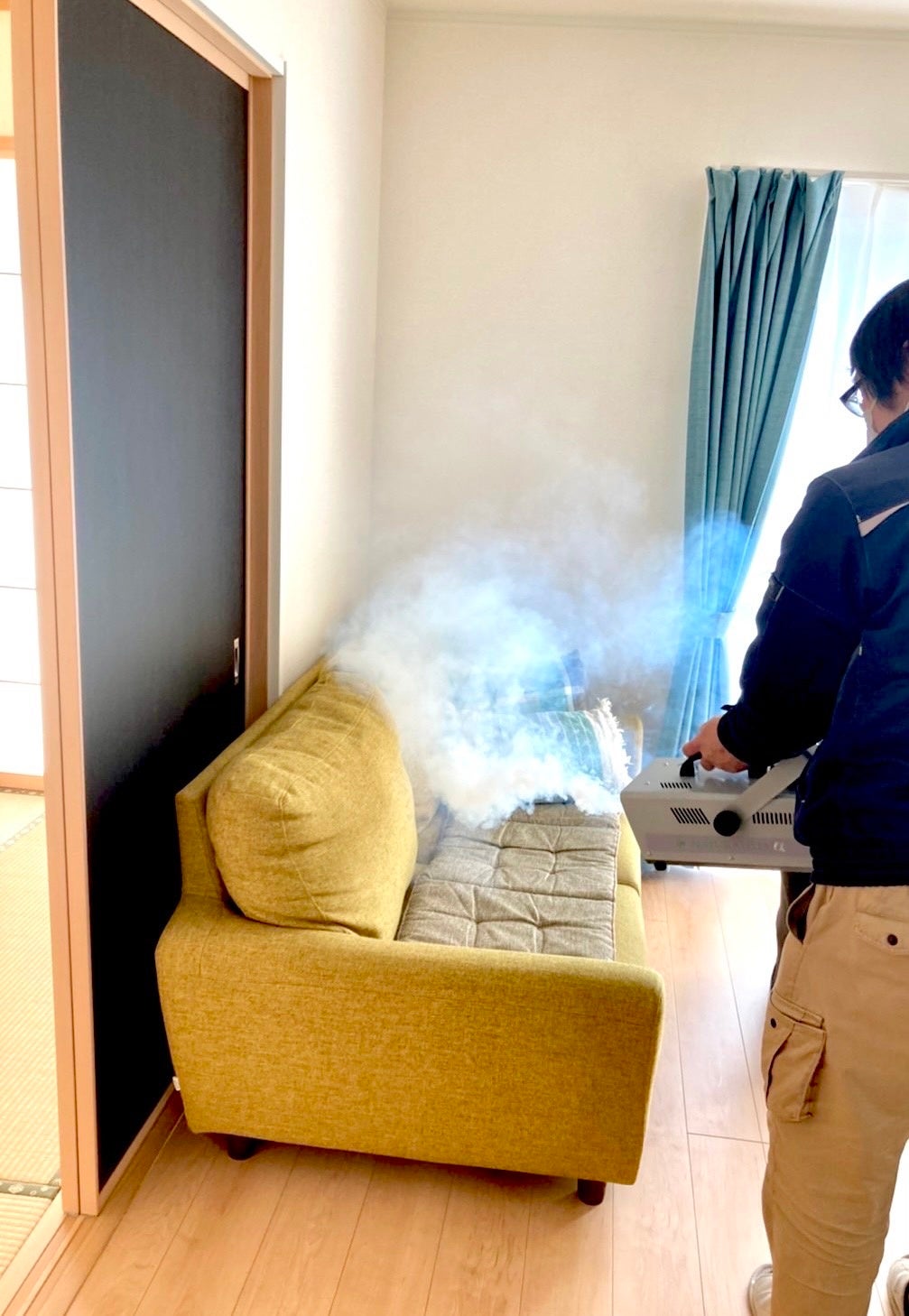 ハウスエイトの除菌サービスは、専用機材で除菌剤をナノレベル粒子にし、人の手が届かない場所やソファー・エアコン、空調のダクト等の除菌はもちろん、空中に浮遊しているウイルスや菌まで除菌を行います。また施工後の匂いは天然由来成分の香りでまるで、森林浴のようなスッキリとした空間にいたします。