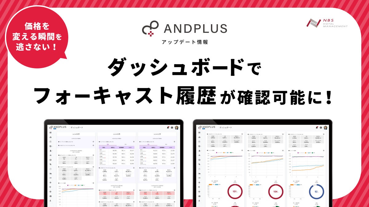 NBSホテルマネジメント株式会社(本社:大阪府大阪市北区、代表取締役:中島秀雄)が開発・提供する宿泊施設向けレベニューマネジメントシステム「ANDPLUS(アンドプラス)」は、ダイナミックプライシングを実践する現場の課題に応えるべく、ダッシュボード上にフォーキャスト履歴を表示する新機能を追加しました。今回のフォーキャスト機能の強化により、3カ月先までの着地予想(売上、ADR、稼働率)を可視化できるようになりました。これにより、日々の価格調整という“戦術”だけでなく、数ヶ月先を見据えた料金戦略や販売計画といった“戦略”の立案が、確かなデータに基づいて行えるようになります。