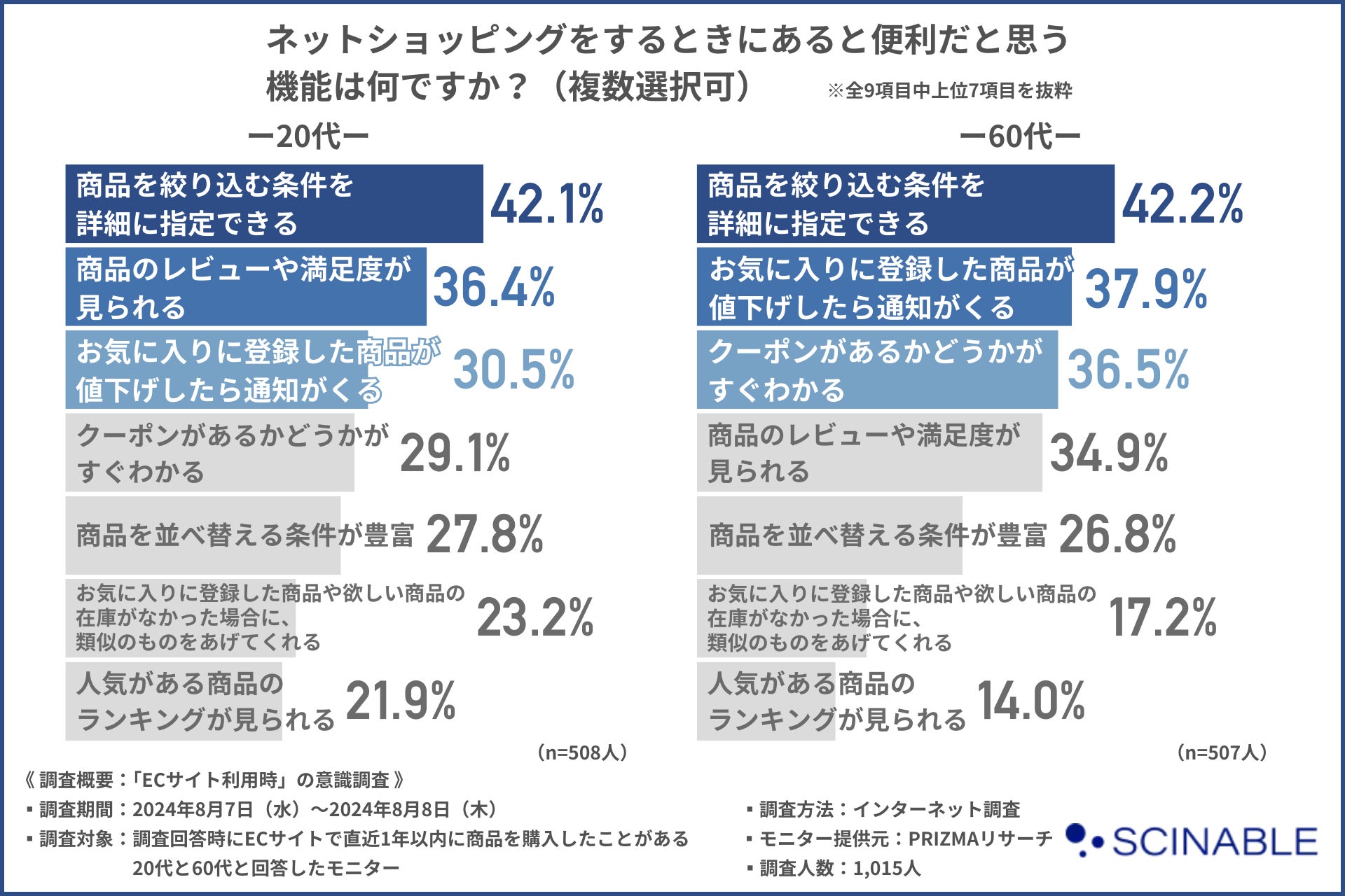 両世代ともに、「商品を絞り込む条件を詳細に指定できる」機能を重視していることから、買い物の際に自分のニーズに合った商品を効率的に見つけたいというニーズが共通していることが示されました。