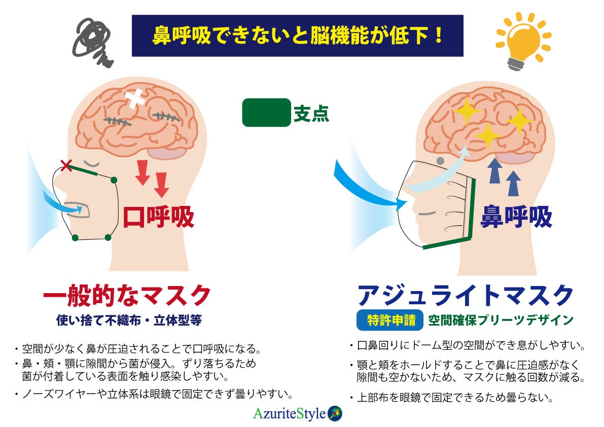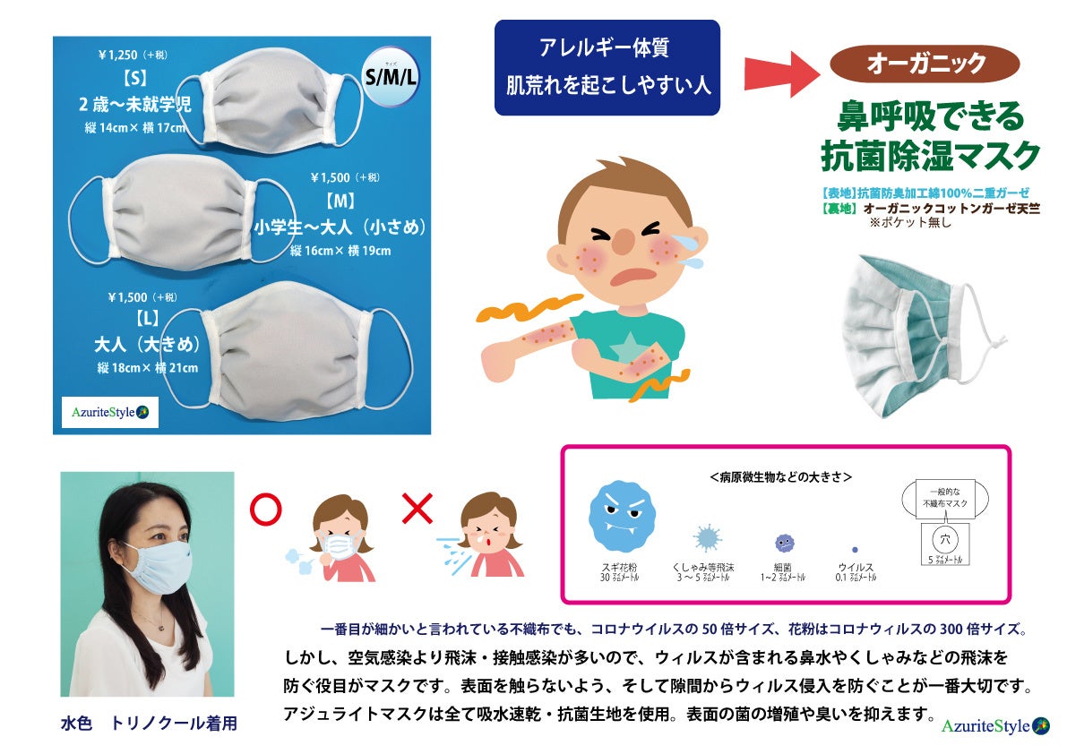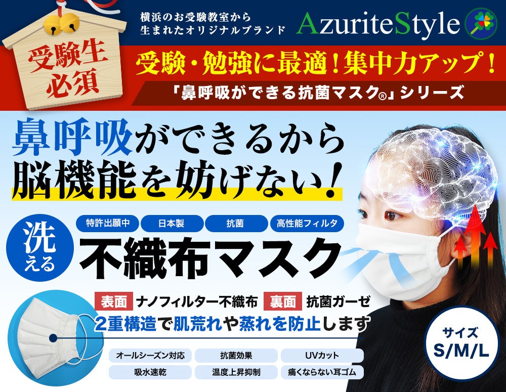 2020年6月発売以来、人気継続中の「鼻呼吸ができる抗菌マスク」シリーズ。横浜の受験教室アジュライト独自の空間確保プリーツデザインで特許申請・商標登録。「洗える不織布&抗菌ガーゼの受験生専用マスク」を限定販売!S.M.Lサイズ展開。