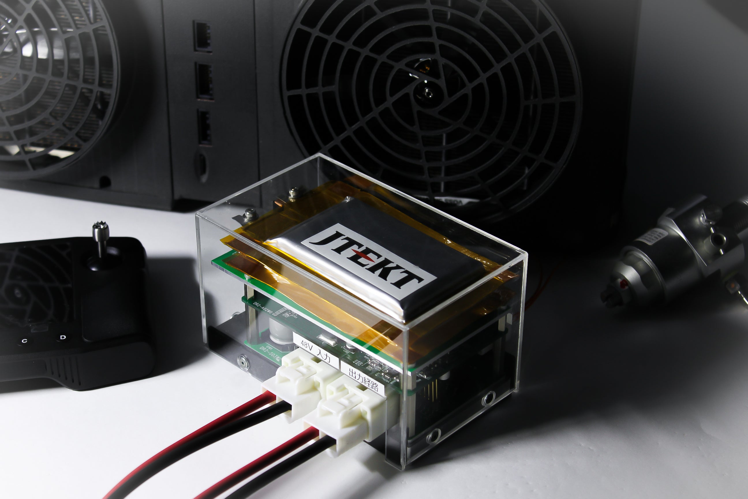 ジェイテクト社は、12V系電源を搭載する大型車両へのEPS搭載を支援することを目的として、キャパシタと充放電コントローラーを従前のEPSに付加するシステムを開発しています。12Vの車両電源に対しキャパシタからの6Vの電圧を付加し18Vの高出力化を実現し、大型車両で必要な操舵アシスト力を確保。乗用車向けのキャパシタの活用は補助電源用途に留まらず、車両電源失陥時にはバックアップ電源として作動するなど自動運転車両の信頼性向上に貢献しています。自動車向けに培った電源システムをドローン用48V電源に改造し搭載。ドローン電源電圧を最大65Vまで昇圧することを実現し、最大電力を最大出力2400Wから3250Wまで引き上げています。