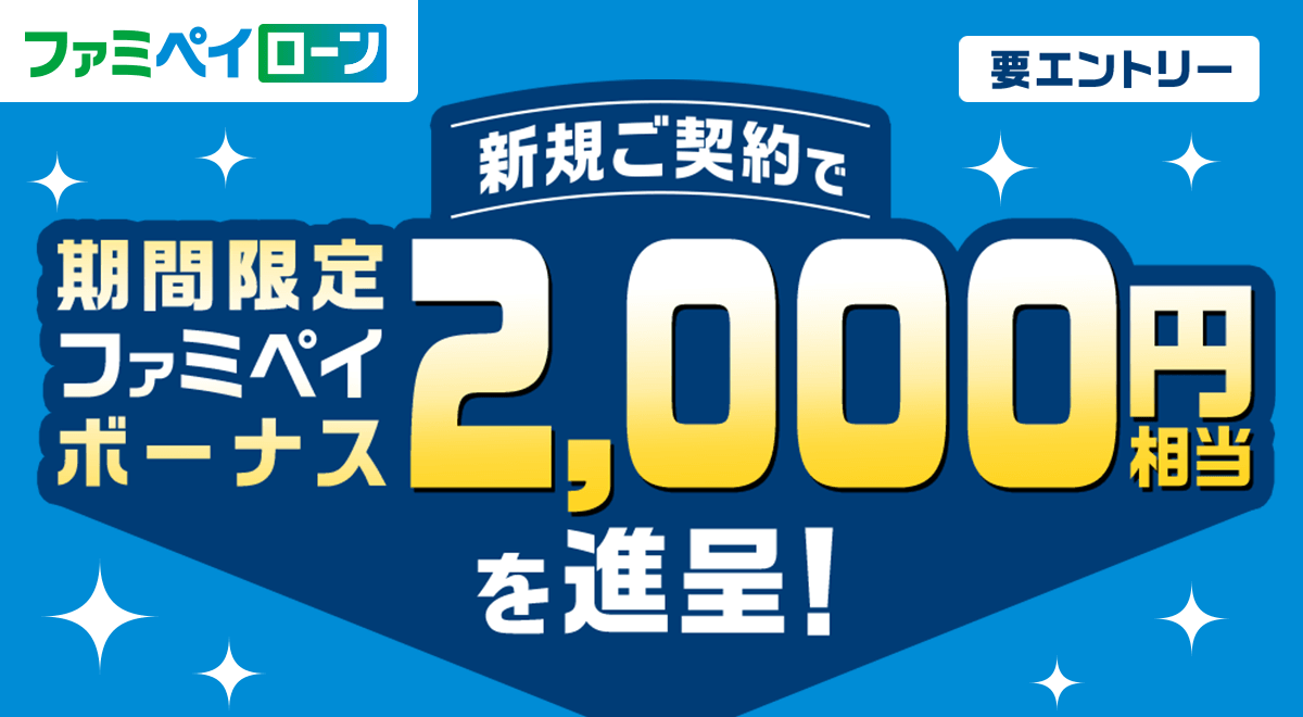 2023年9月1日(金)以降に、新規にお申込みのうえファミペイローンをご契約いただくと、もれなく期間限定ファミペイボーナス2,000円相当を進呈いたします。