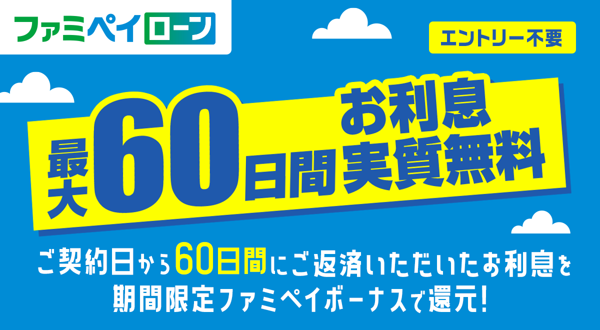 2023年9月1日(金)以降に、新規にファミペイローンをご契約いただくと、ご契約日を含む60日以内にご返済いただいた際の利息相当額を期間限定ファミペイボーナスで還元します。還元に上限はございません。