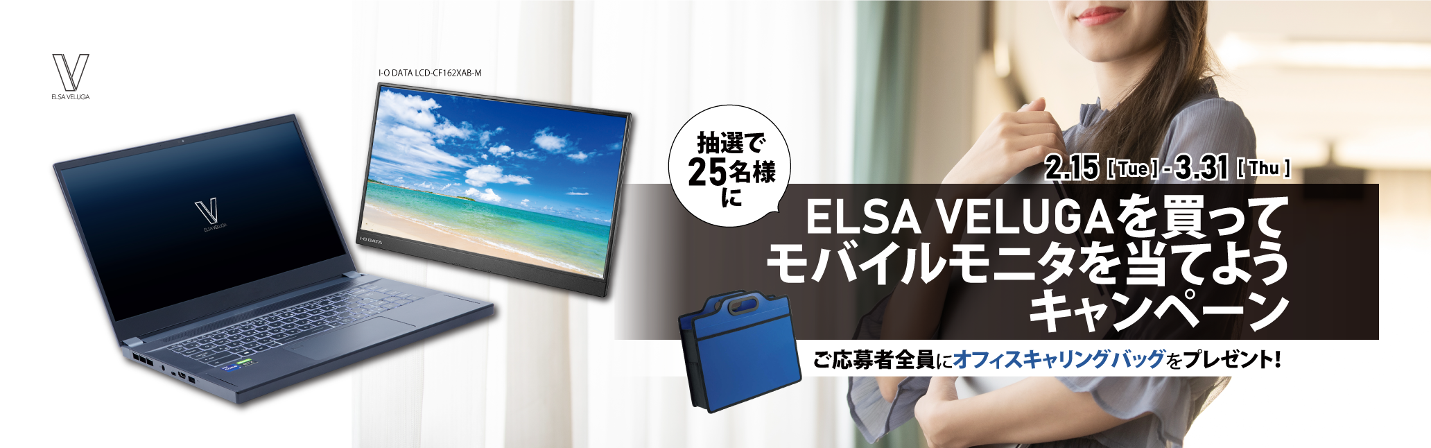 弊社ではこの度、期間中に対象のELSA VELUGAシリーズモバイルワークステーションをお買い上げいただきご応募いただいた方の中から抽選で25名様に15.6インチモバイルモニタが当たるキャンペーンを実施いたします。