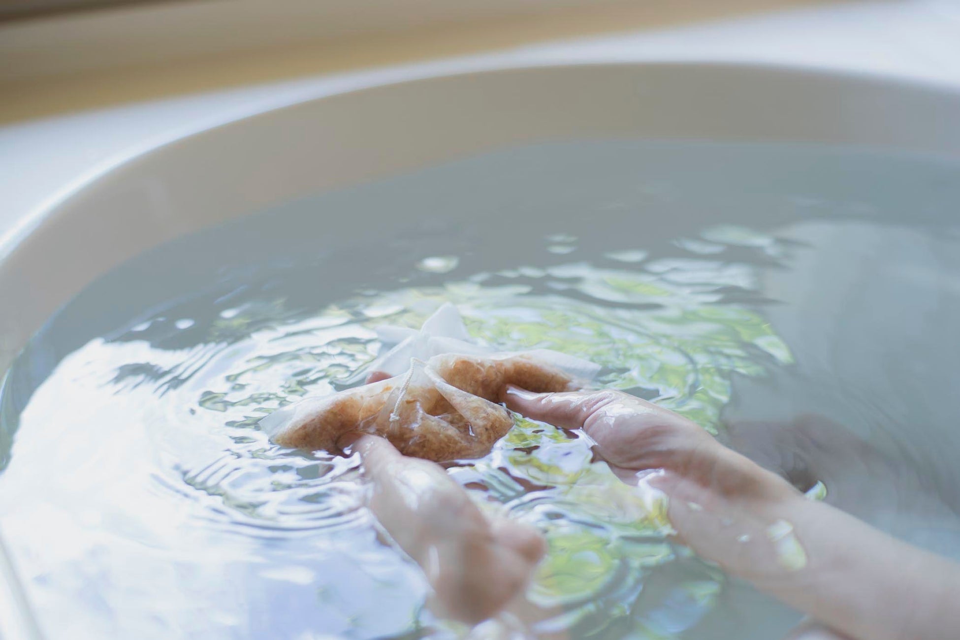 お湯をはります。巾着をやさしく揉みながら、じんわり広がる植物の香りをお楽しみください。1個で2回、使えます。使用後は、天日干しで乾燥させ、靴箱などで消臭剤として約3ヶ月リユースできます。