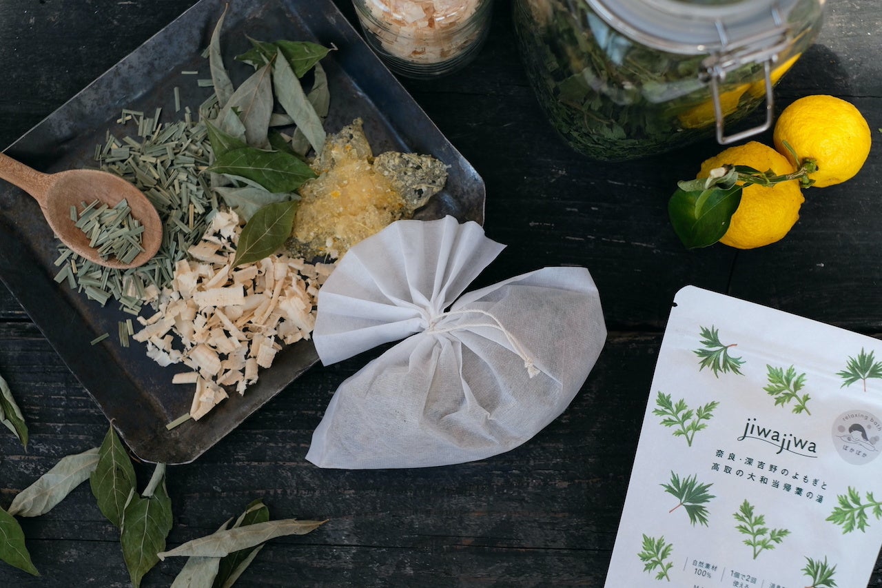 チアフル株式会社が企画運営するブランド「jiwajiwa」の定番商品「お風呂のハーブ」は自然素材 100%の入浴料。無農薬・無化学肥料で栽培された食用の植物(ひのき以外)を、そのまま乾燥させ専用の巾着に詰めています。障がい者・要介護高齢者が一つ一つ手づくりし、生産管理や情報発信には在宅ワークの母親たちが携わっています。