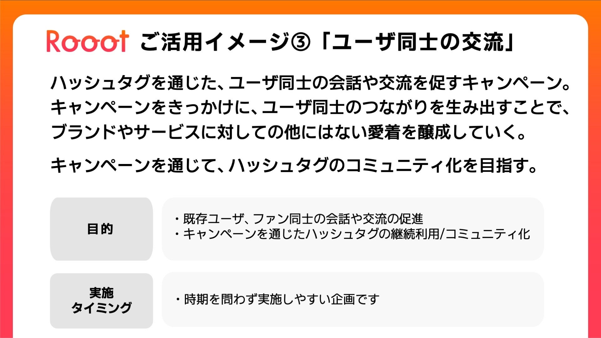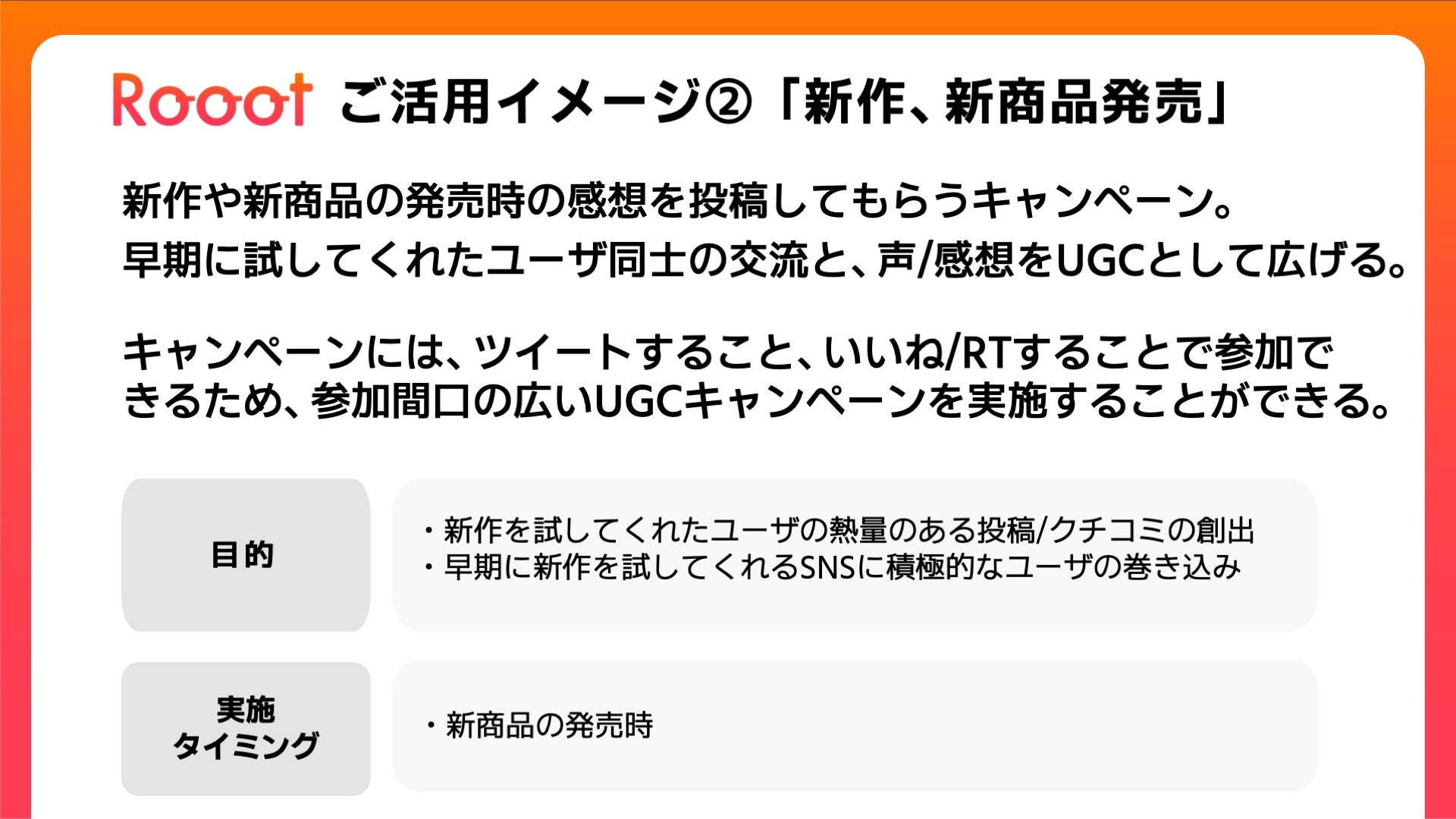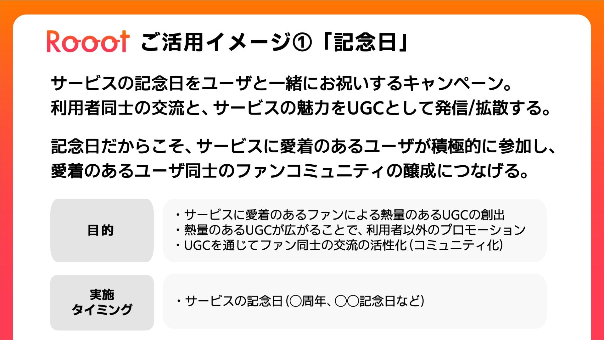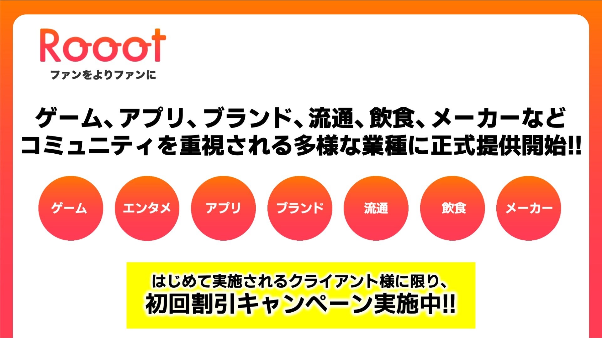 「Rooot」は2021年1月の提供開始以降、ゲーム業界を中心にご活用いただいてきましたが、多くのサービスからご好評いただき、半数以上の企業様がリピートで複数回のご活用をいただいております。また、ゲーム業界以外の企業様からのご利用に関するお問い合わせをいただくことが増えており、アプリ、ブランド、流通、飲食、メーカーなどコミュニティを重視される多様な業界向けにサービスの正式提供を開始いたします。