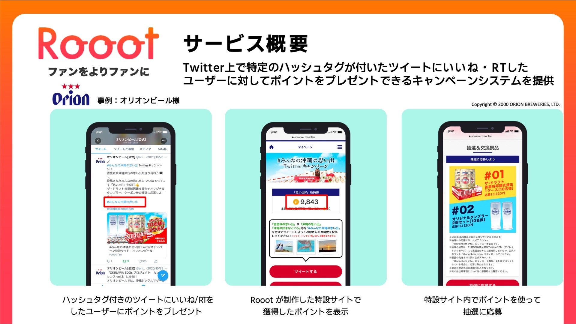 「Rooot」は、Twitter上で特定のハッシュタグが付いたツイートに「いいね・RTしたユーザー」に「ポイント」をプレゼントできるサービスです。具体的には、ユーザーは獲得した「ポイント」を使って、Roootが用意する特設サイト内でクライアント様にご用意いただくクーポンのプレゼントや景品やグッズ等への抽選などのプレゼントに応募等ができます。このRoootの仕組みにより、Twitter上でユーザー同士(ファン同士)で盛り上がれるきっかけや、ユーザー同士(ファン同士)でつながるきっかけを提供することができます。Twitterがファンにとってよりコミュニティになり、コミュニティが生まれることで、よりファンになっていただくことができます。