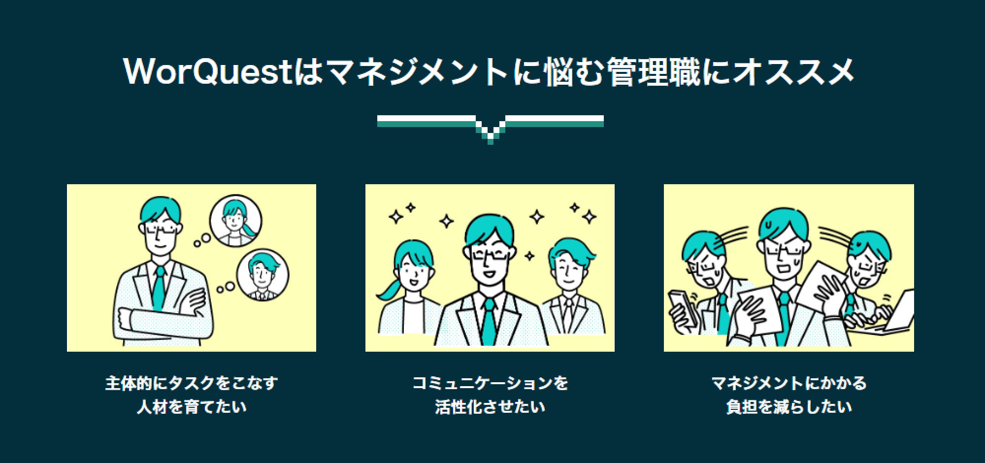 WorQuestとは、チームの仕事をRPGに置き換え、タスク(的)をこなす(倒す)事でスキルアップを実現するタスク管理ツールです。チームで共通の敵を倒し、共に成長する事で仕事のやりがいや楽しさを実感してもらう事ができます。