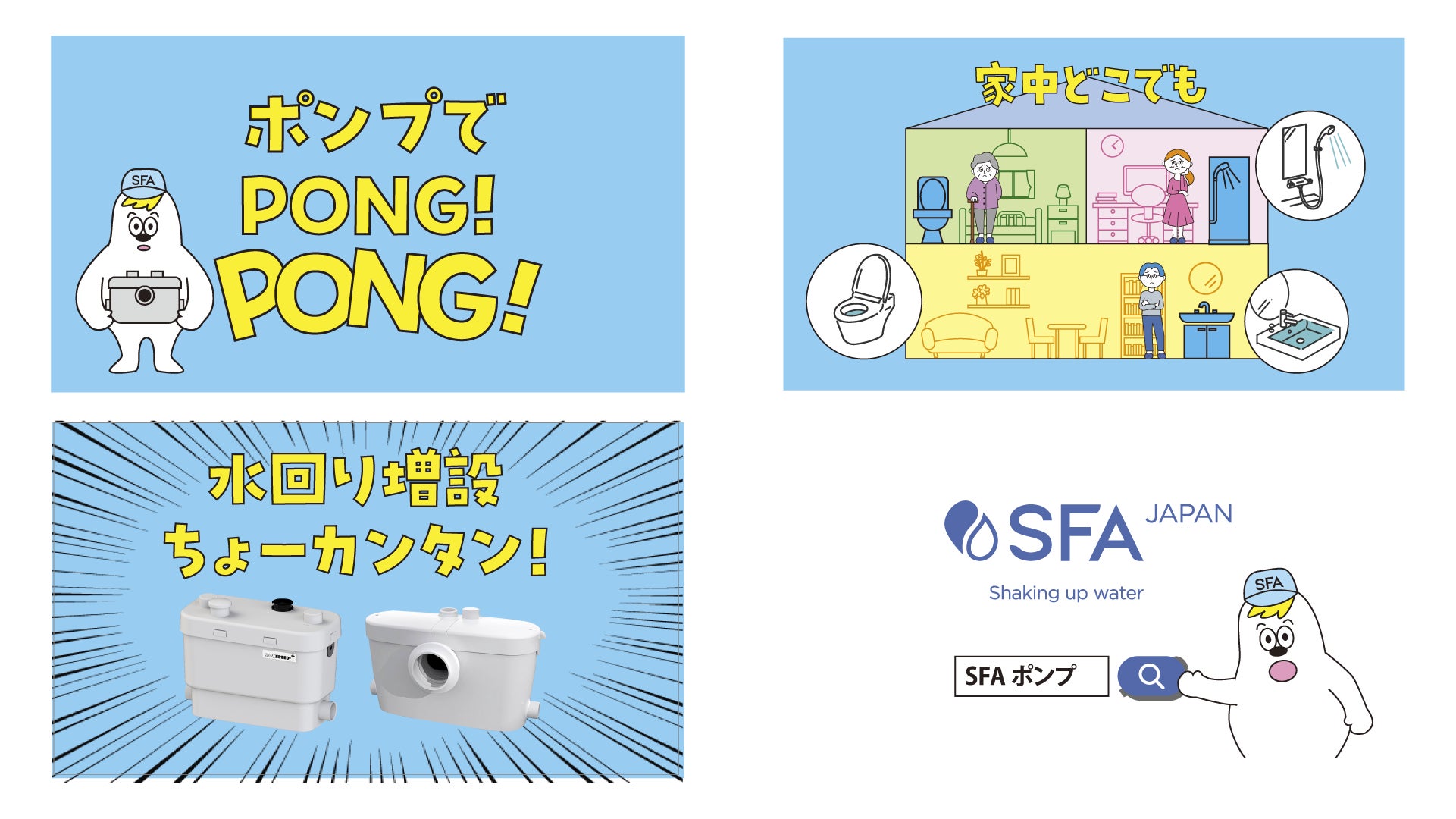 新CMは、SFAポンプが実際に導入されている施工事例から選別したケースをまとめ、テレビCMでおなじみのSNSでバズった曲と、カラフルでポップなキャラクターを通して、『SFAポンプを使えば、家中どこにでも簡単に水回りを新設できる』というメッセージをお届けします。