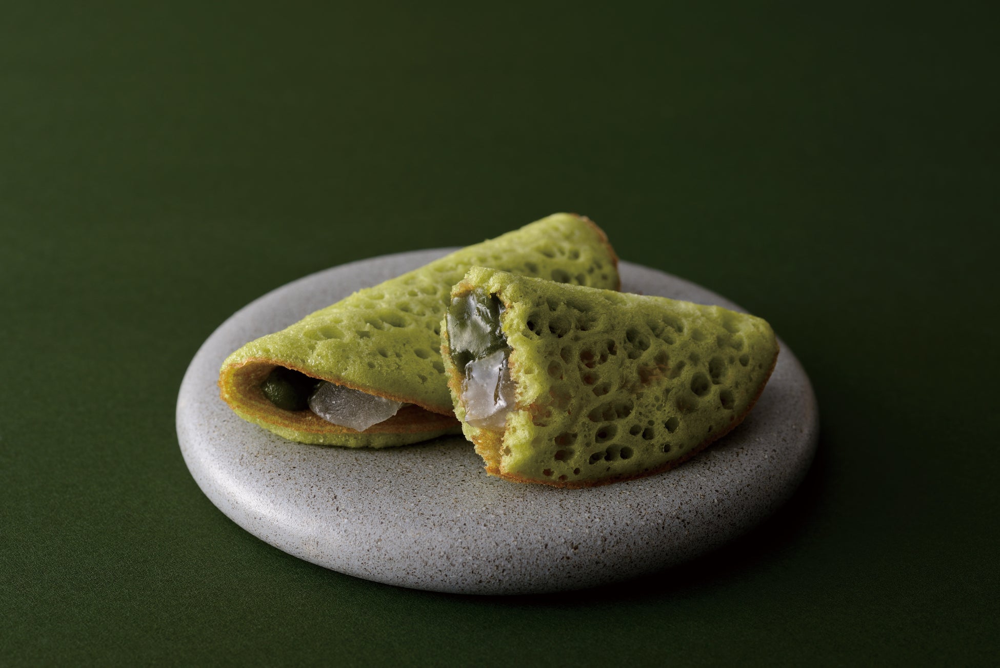 しっとりやわらかく焼き上げた生地で、宇治抹茶餡とわらび餅を挟んだ艶ぶくさです。
