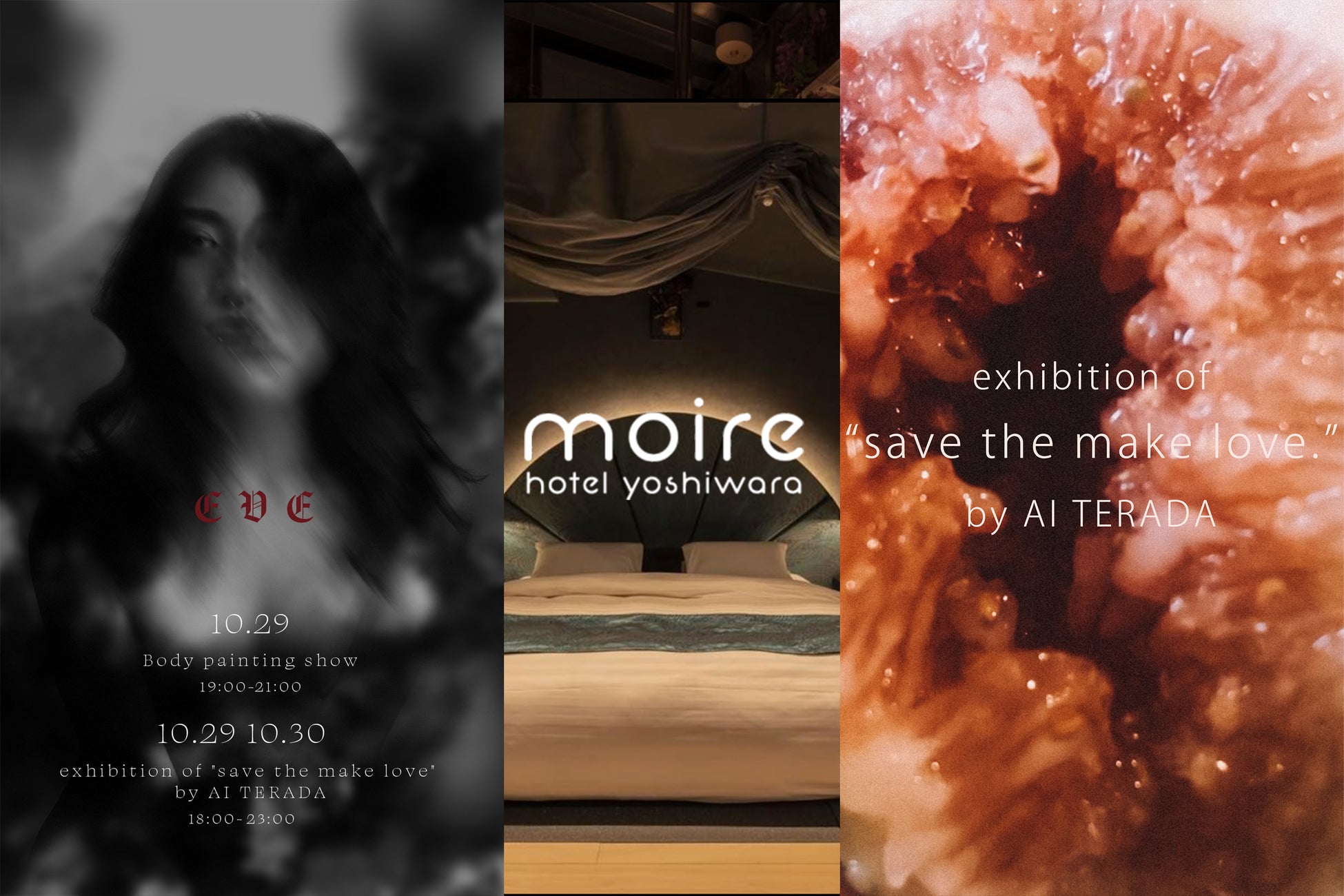 10月29日(土)・30日(日)、日本随一の色町遊廓・吉原にあるアート空間moire cafe/hotelにて、共に名前に"愛"がつく気鋭アーティスト愛奈とAI TERADAがイベントを開催。二日間を通じ、多様な愛の在り方を追究・提議する。29日は愛奈がペインターにAlex Osmozeを迎え、聖書に描かれたアダムとイヴの物語、イヴの抱える負の感情をテーマ切り口としたライブボディペイントパフォーマンスとイラスト展示を実施。