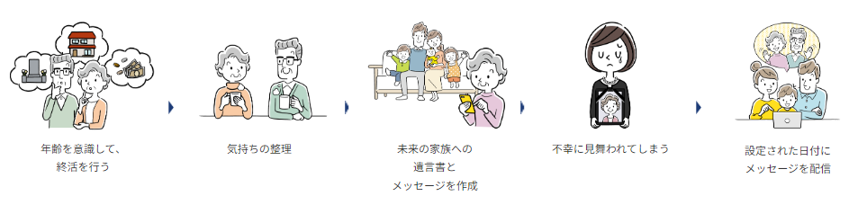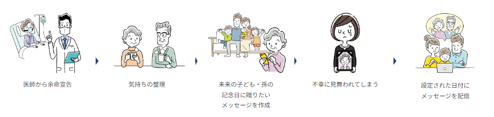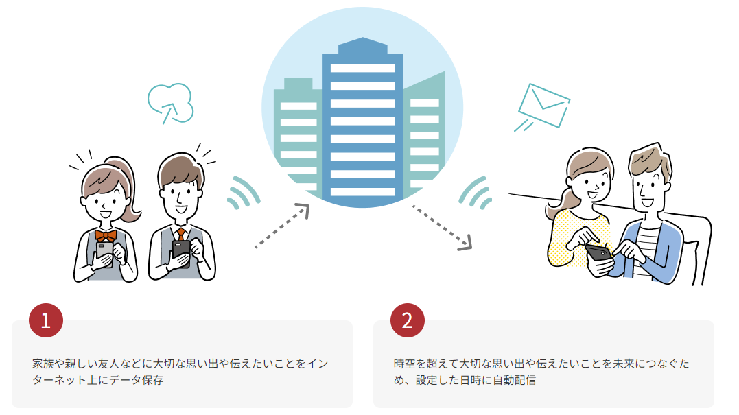 家族や友人に伝えたい伝言やメッセージを事前にインターネット上に保存して、設定した時間や送信先に合わせて送付できます。