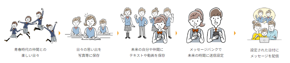 日々の何気ない写真や動画、友人に向けての想いをメッセージバンクに預けて、遠い未来に送信する設定にしておけば何年後・何十年後にその思い出を懐かしむことができます。