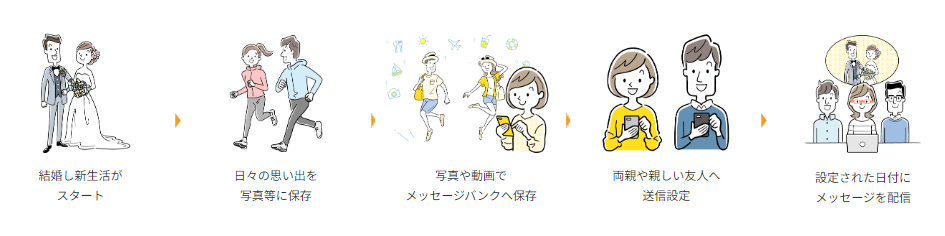 メッセージバンクは、伝えたい想いや伝言・思い出の写真や動画を預けておき、送信先と日時を指定して任意のタイミングで送信できるサービスです。