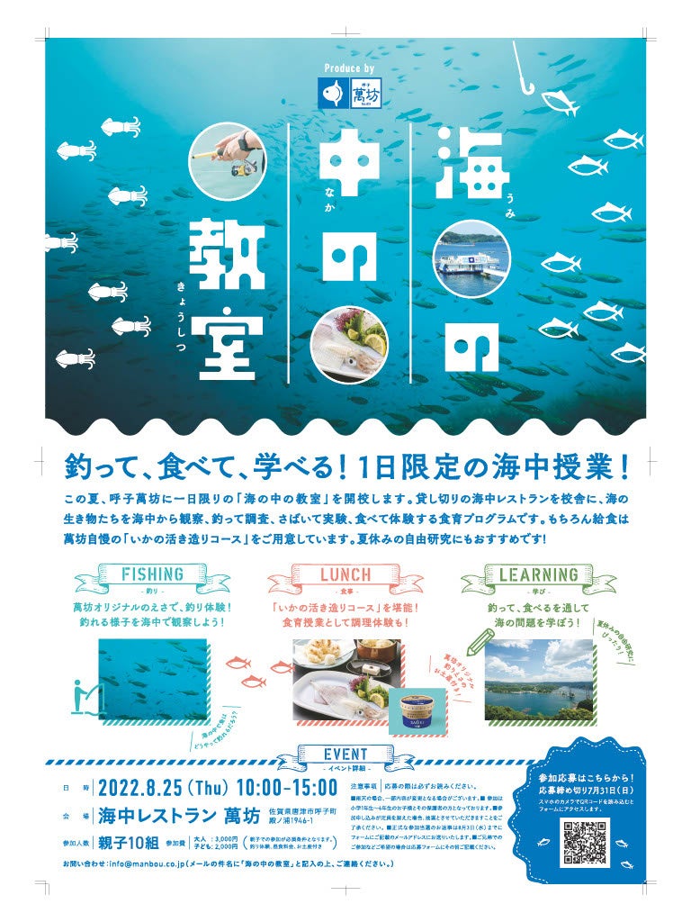 呼子の海に浮かぶ「海中レストラン萬坊」を校舎に、海の生き物たちを海中から観察、釣って調査、さばいて実験、食べて体験する食育プログラムです。もちろん給食は萬坊自慢の「いかの活き造りコース」をご用意。夏休みの自由研究にもおすすめです!
