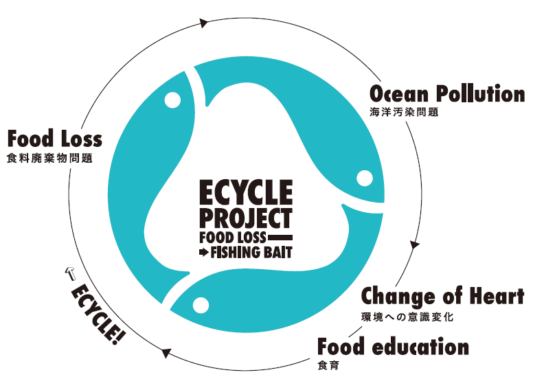 食料廃棄物を釣りえさに加工することでフードロスを減らし、海と魚にやさしい釣りを楽しむことができる。さらに、海の環境問題への関心と行動が生まれ、子どもたちの食育にもつながる。釣りえさを中心に海や環境への還元というサイクルが生まれることを目指しています。