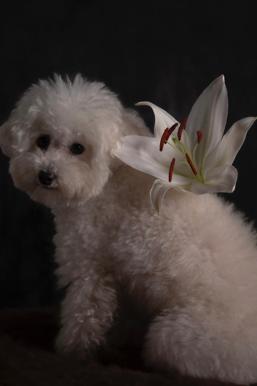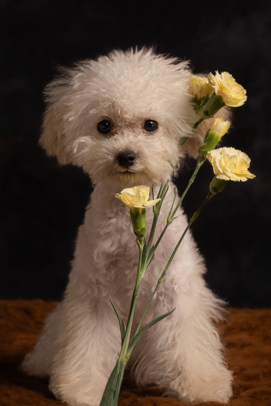 「絵画のように飾れるアート写真」を目指し、フラワーアーティストである妻とフォトグラファーの夫により開発されたこのプロジェクトは、今まで着目されてこなかった花と犬の相性にフォーカスします。