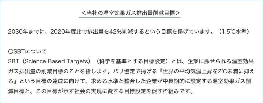 SBT(Science Based Targets)(科学を基準とする目標設定)とは、企業に課せられる温室効果ガス排出量の削減目標のことを指します。パリ協定で掲げる『世界の平均気温上昇を2℃未満に抑える』という目標の達成に向けて、求める水準と整合した企業が中長期的に設定する温室効果ガス削減目標と、この目標が示す社会の実現に資する目標設定を促す枠組みです。