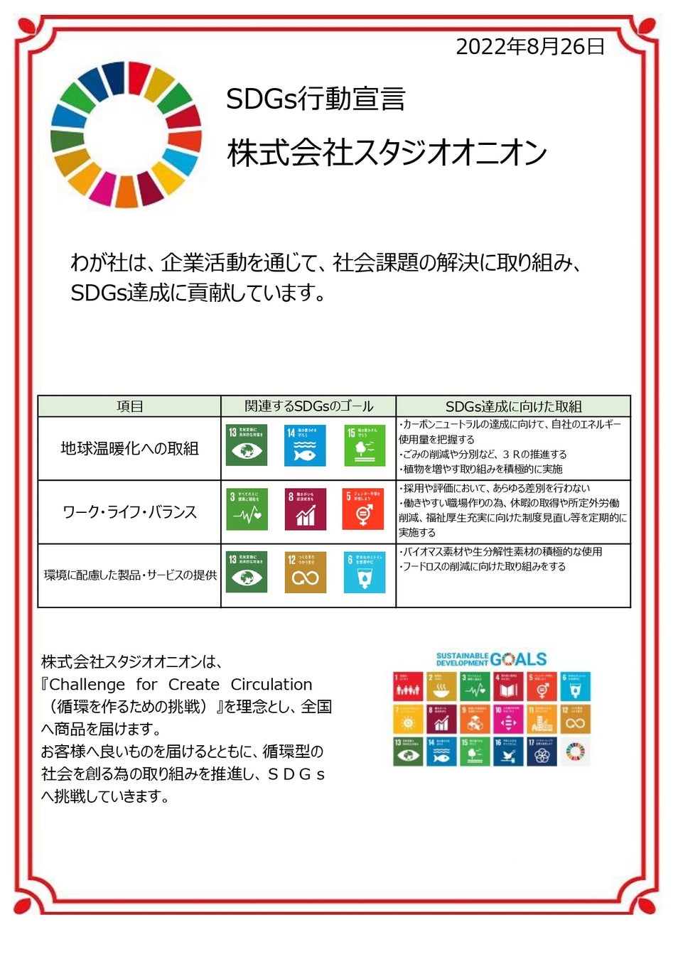 株式会社スタジオオニオンは、『Challenge for Create Circulation(循環を作るための挑戦)』を理念とし、全国へ商品を届けます。