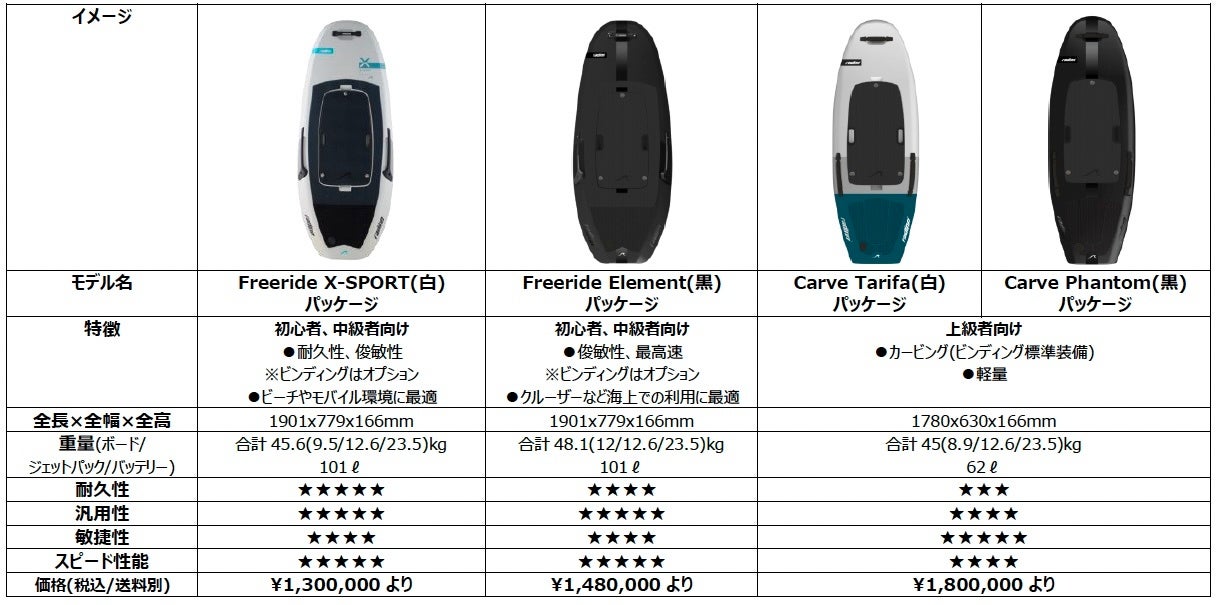 その他、2022年モデルは、安定感と敏捷性のバランスを重視したFreeride(フリーライド)とカービングを重視した上級者向けCarve(カーブ)3種類のスタイルのボードから色や形状が異なるバッテリー容量などの組み合わせの中からスタイルや用途にあった仕様を選択することが可能です。