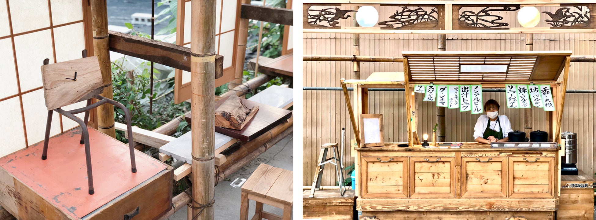 私たちは、当時、漠然とした虚無感から、解体現場からまだ使えそうな古材や古物を回収することを繰り返していましたが、それがやがて活動となり、回収するだけではなく誰かにパトンパスをしていくことで「ものの寿命」をつないでいけるのではないかと考えいたりました。それらを飲食業と絡め、ある空き地に「不死鳥喫茶」というポップアップストアで古材や古物をリメイクして、それを必要とする誰かにパスするというプロジェクトをしてきました。不死鳥は再生のアイコンです。