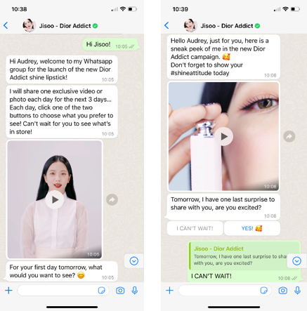 キャンペーンは@diorbeautyの960万人のInstagramフォロワーを対象に実施され、2022年5月4日から4日間にわたって限定コンテンツと、新リップスティック「ディオール アディクト シャイン」キャンペーンのミューズとの会話をWhatsApp上で提供しました。