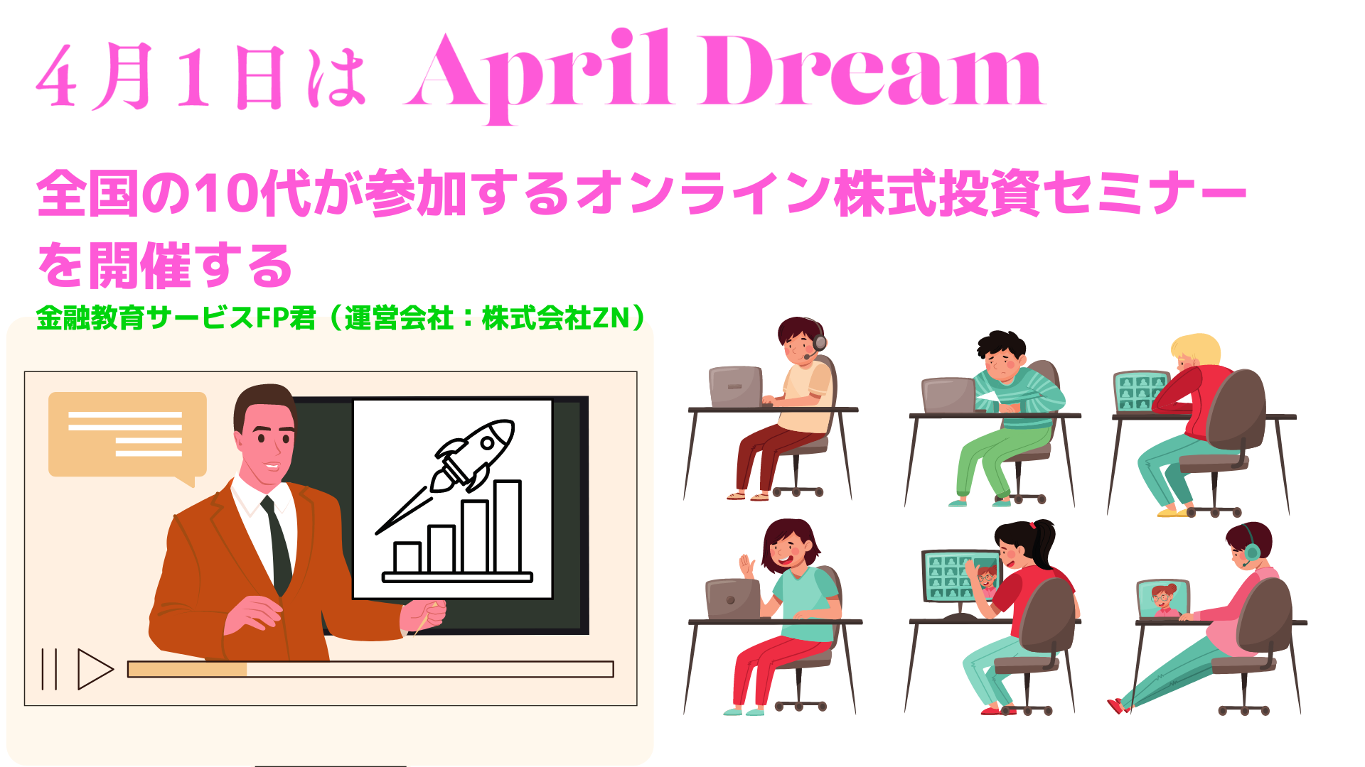 当社は、4月1日を夢を発信する日にしようとするApril Dreamに賛同しています。このプレスリリースは「株式会社ZN」の夢です。高校の家庭科では資産形成の授業が始まることもあり、これからは投資を10代で学ぶ時代です。当社は金融教育を行うFP法人として、10代の方々に株式投資の面白さを伝えていきます。