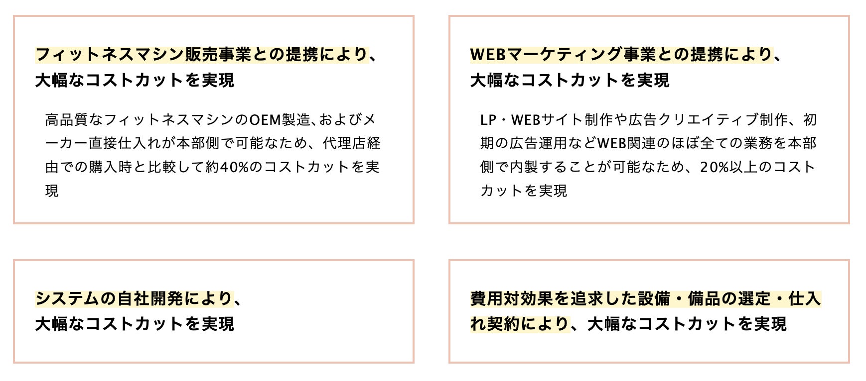 フィットネスマシン販売事業との提携、WEBマーケティング事業との提携、システムの自社開発などにより、大幅なコストカットを実現。