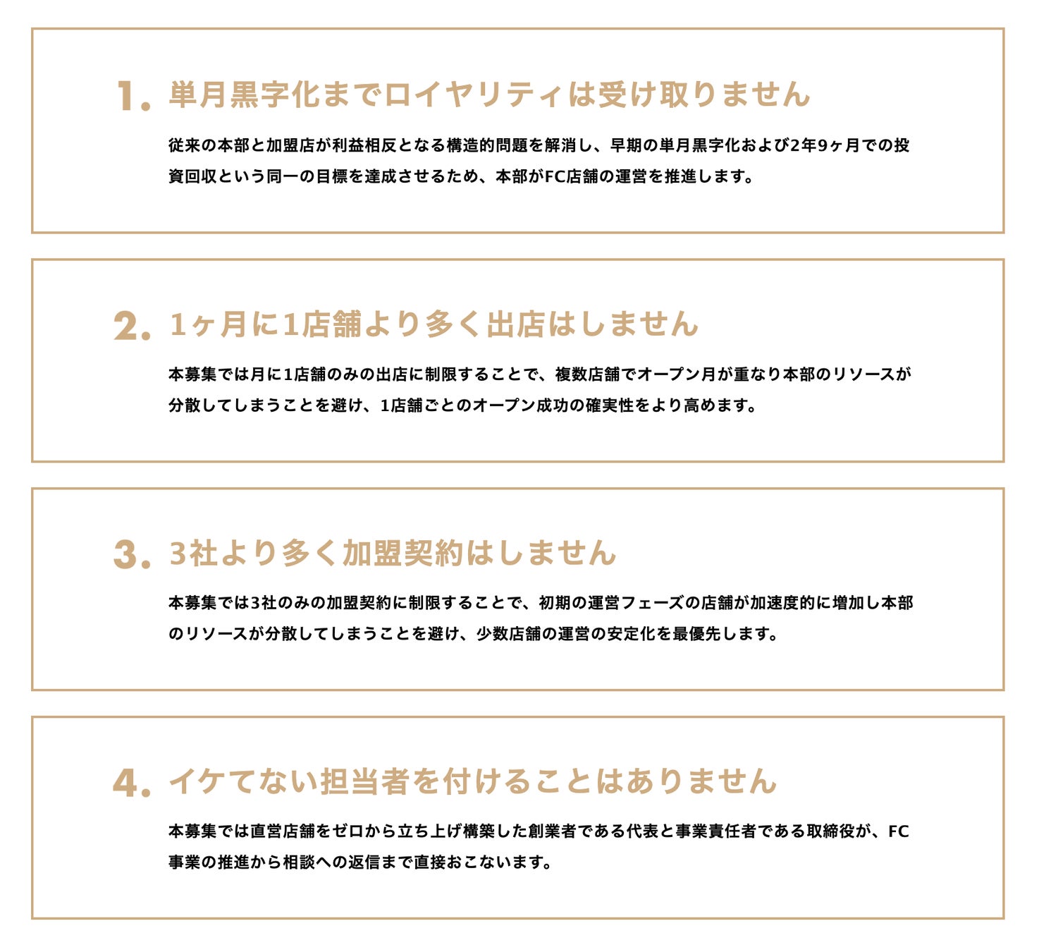 単月黒字化までロイヤリティは受け取りません。複数店舗同時オープン、複数同時契約もいたしません。
