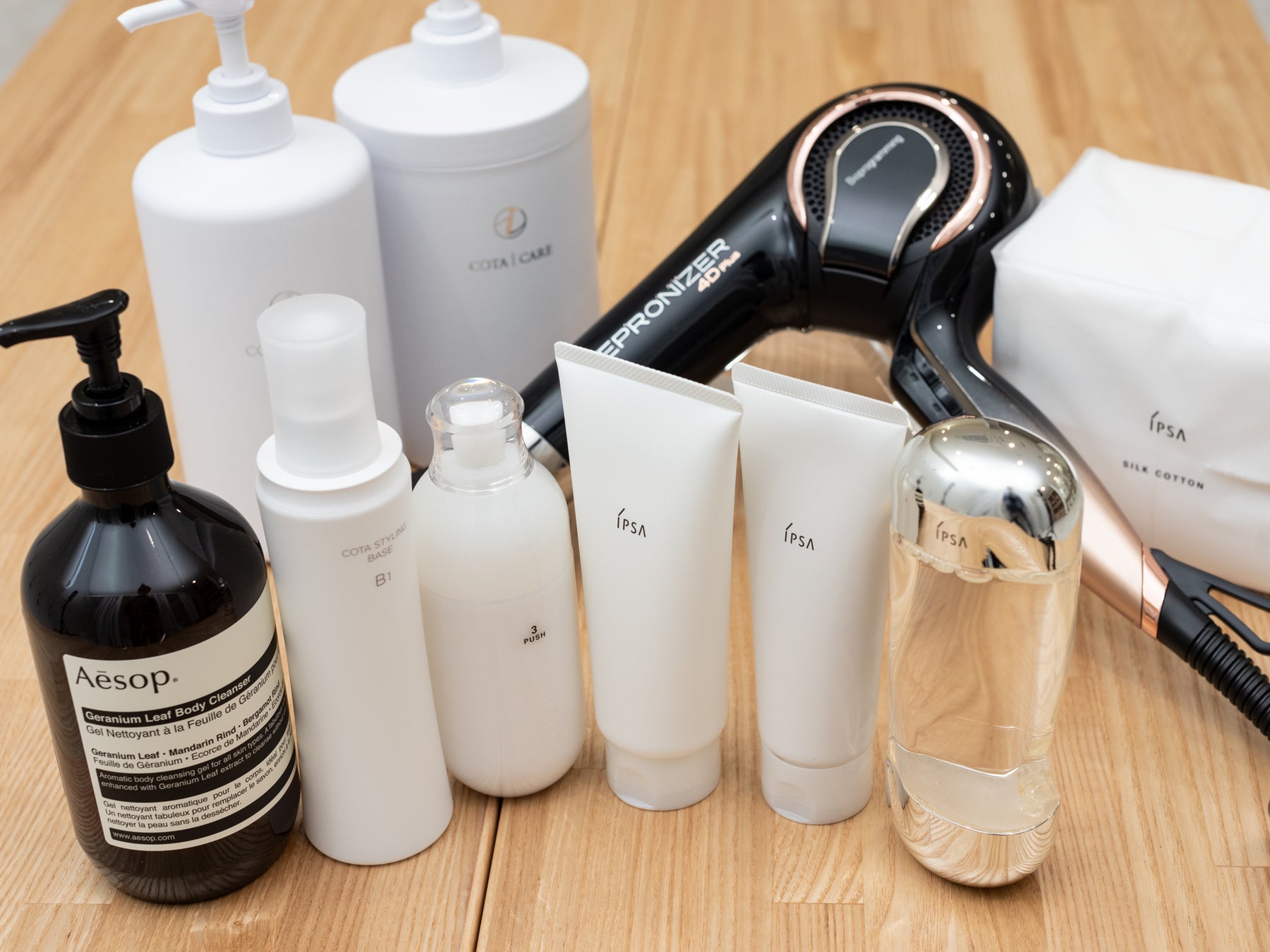 サロン専売品の「シャンプー・トリートメント」「ボディソープ」や、「クレンジング・洗顔」「化粧水・乳液」など全てのアメニティを取り揃えています。