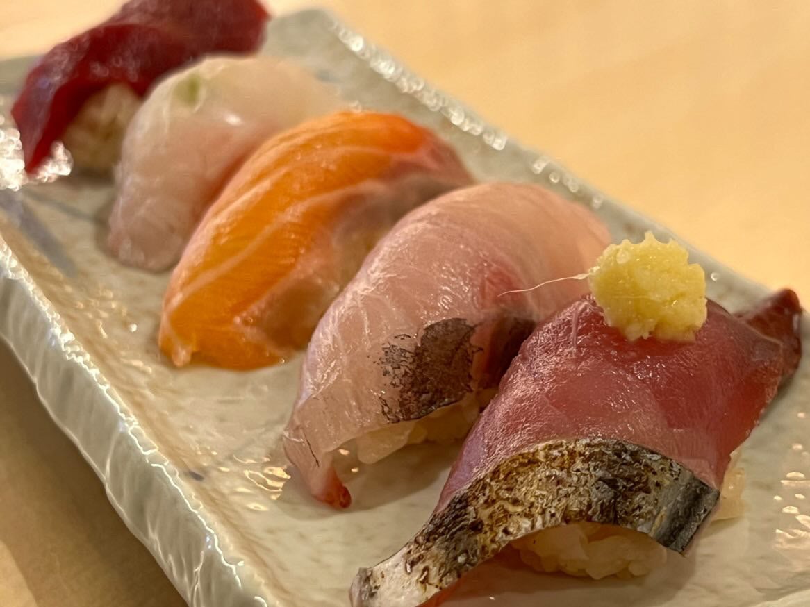 コハダや春子鯛や季節のネタをオマカセで楽しんで欲しいとネタを敢えてを決めない「大将おまかせ5カン盛り」799円(税込879円)。通な方には、お好みで自分の好きなネタを楽しめるようにネタごとのオーダーも可能。