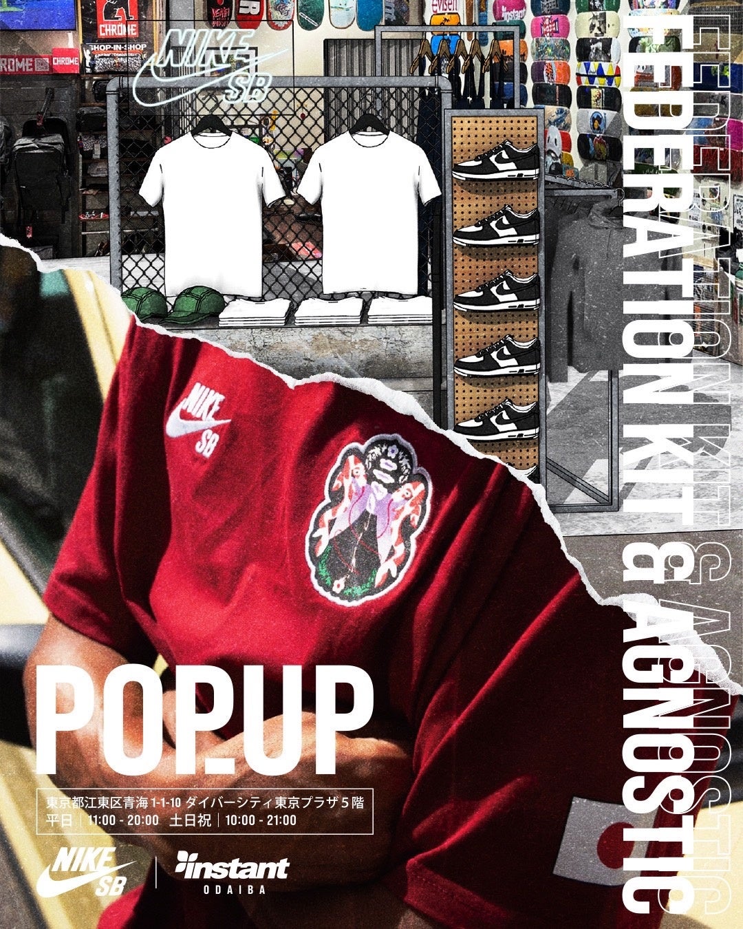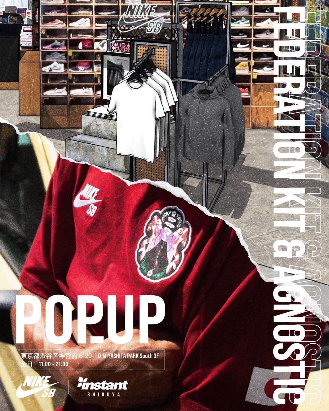 『ナイキ SB フェデレーションキット』の発売日となる7月20日(土)から有限会社インスタントの「instantお台場ストア」と「instant渋谷ストア」にて『Nike SB FederationKit & Agnostic Pop Up』を開催いたします。アレクシス・サブローンのデザインによるコレクションをお手元にとり、最新の『Nike SB フェデレーションキット』の世界観をたっぷりとご堪能いただけます。また店内はマルセル・フェルドマンによる、Nike SBチームのパリツアーの写真をお楽しみいただけます。