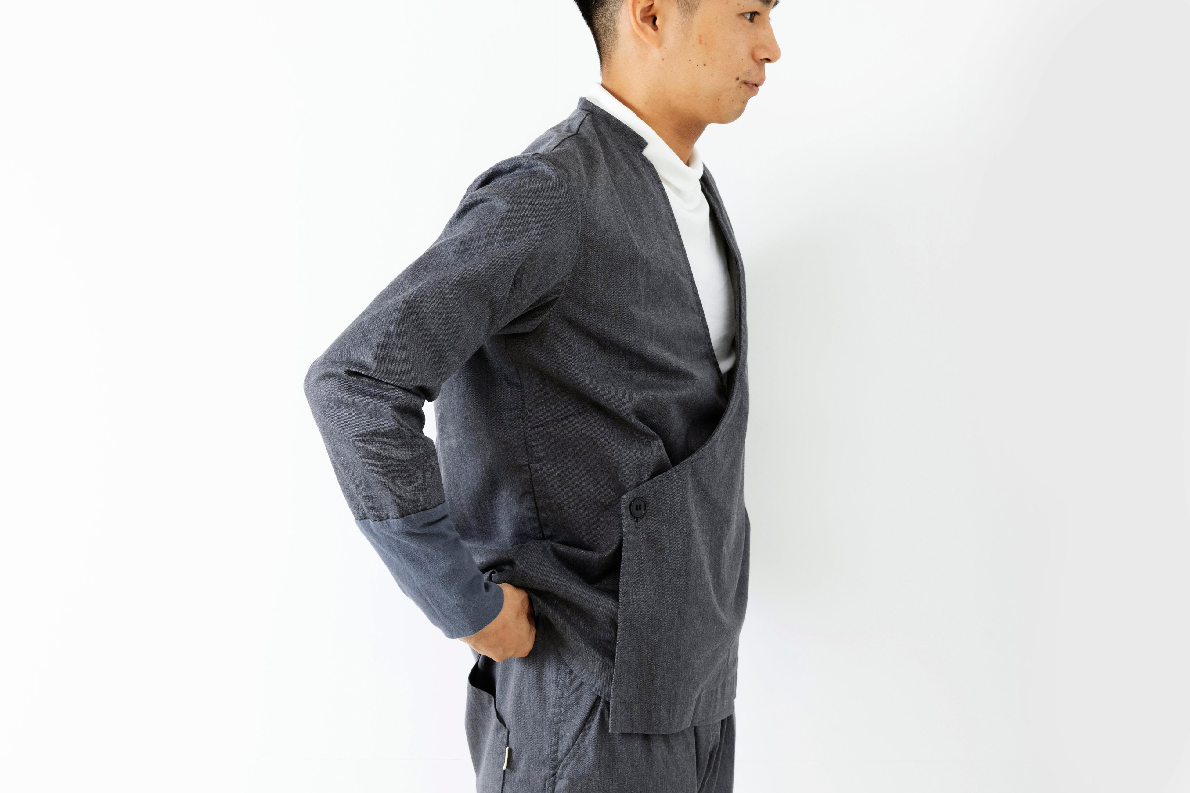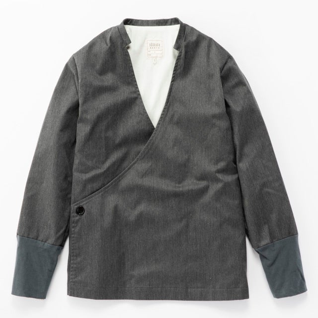 部屋着のイメージが強い作務⾐をセミフォーマルな作業着にデザインした「⽴襟作務⾐」