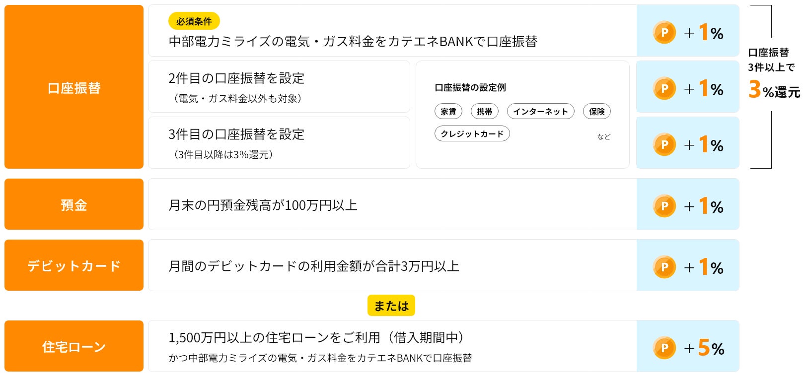 銀行サービスの利用状況に応じ、毎月、中部電力ミライズの電気・ガス料金のお支払い額の最大5%がカテエネポイントで還元されます。(一月あたり3,000ポイントが上限)