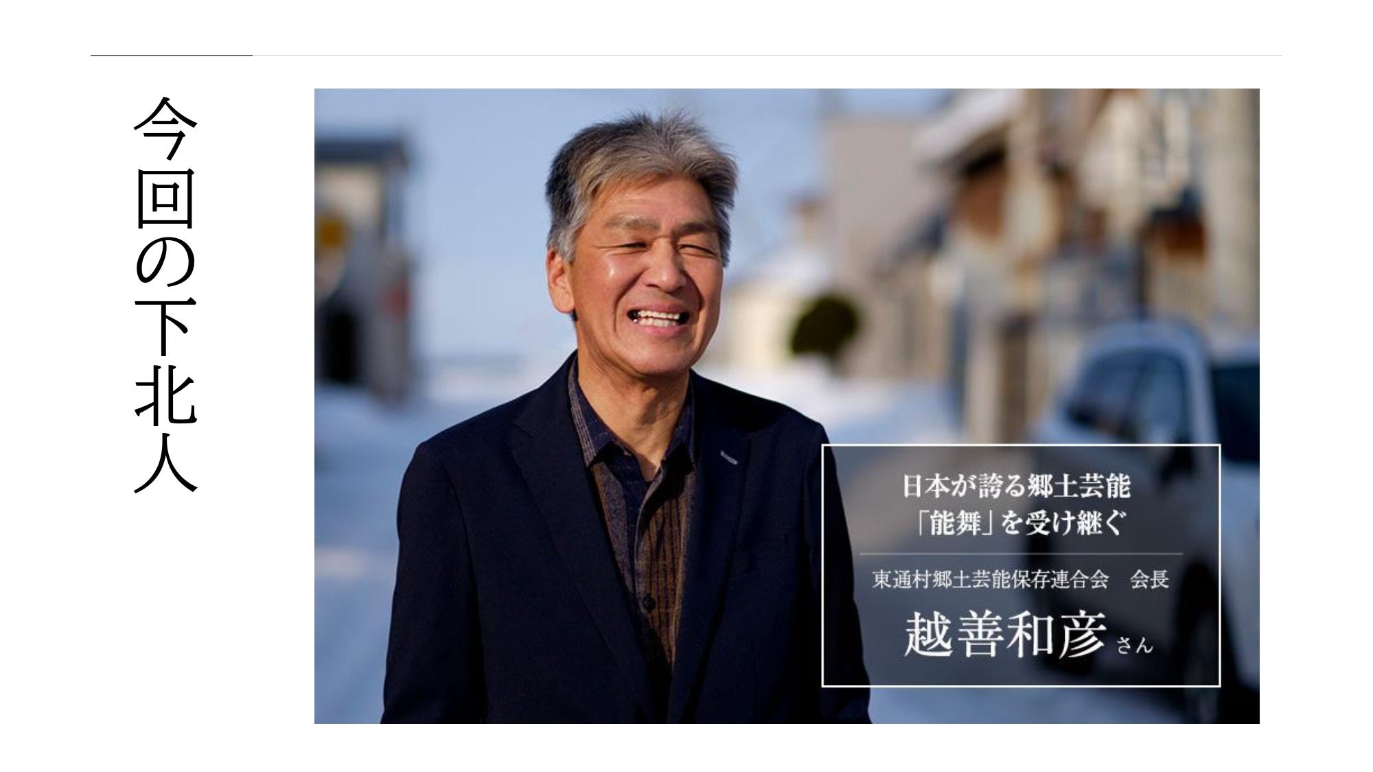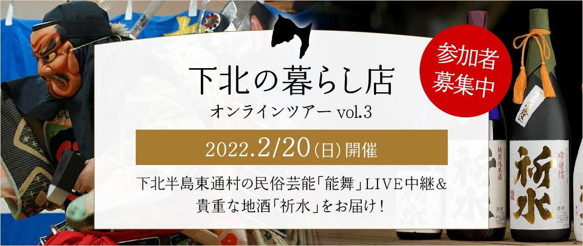 一般社団法人しもきたTABIあしすと(理事長:宮下宗一郎)は、~下北半島東通村から、民俗芸能「能舞」をLIVE中継&貴重な地酒「祈水」をお届け!伝統を守り続ける下北人「越善和彦さん」に会いに行くオンラインツアー~を2月20日(日)に開催します。