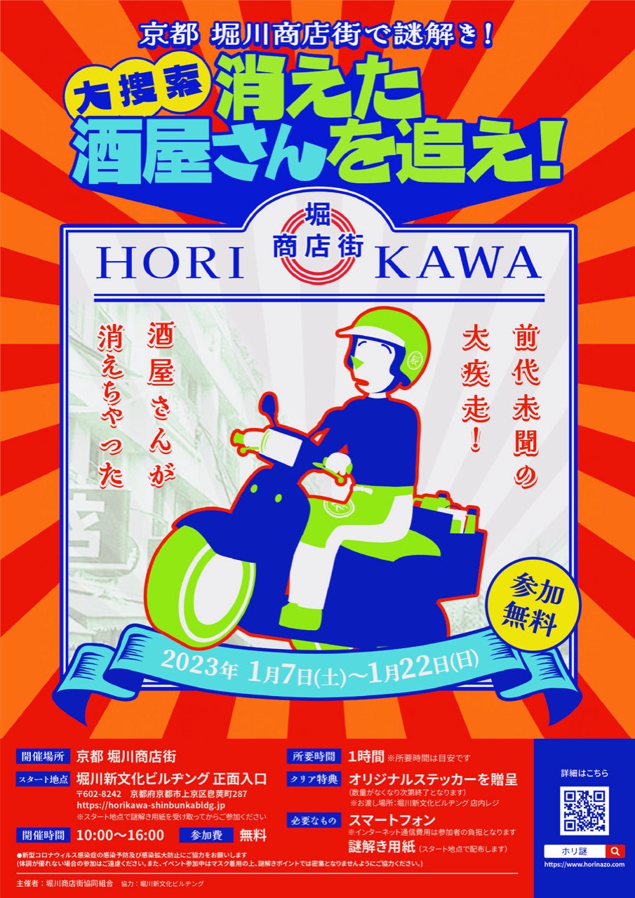 京都西陣・堀川商店街にて、2023年1月7日(土)~1月22日(日)まで、参加費無料の謎解きイベントを開催!