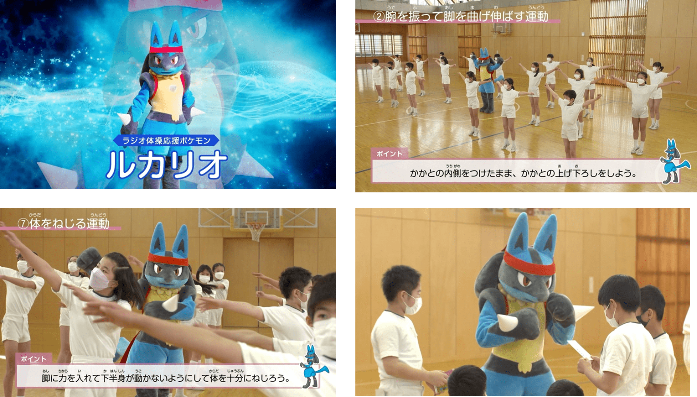 その中でも特に、体力低下が懸念されているコロナ禍で子どもたちの体力づくりのサポ ートは重要だと考え、ルカリオと共に、自宅でも簡単に取り組めるラジオ体操をより身近 に感じていただけるよう、活動して参ります。