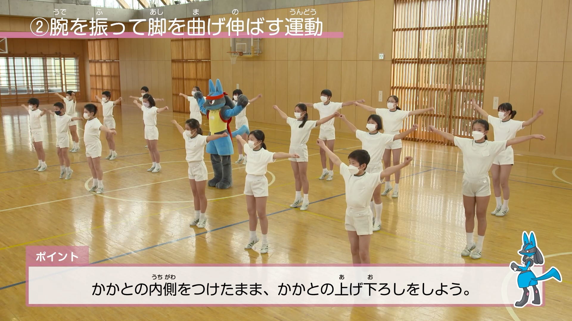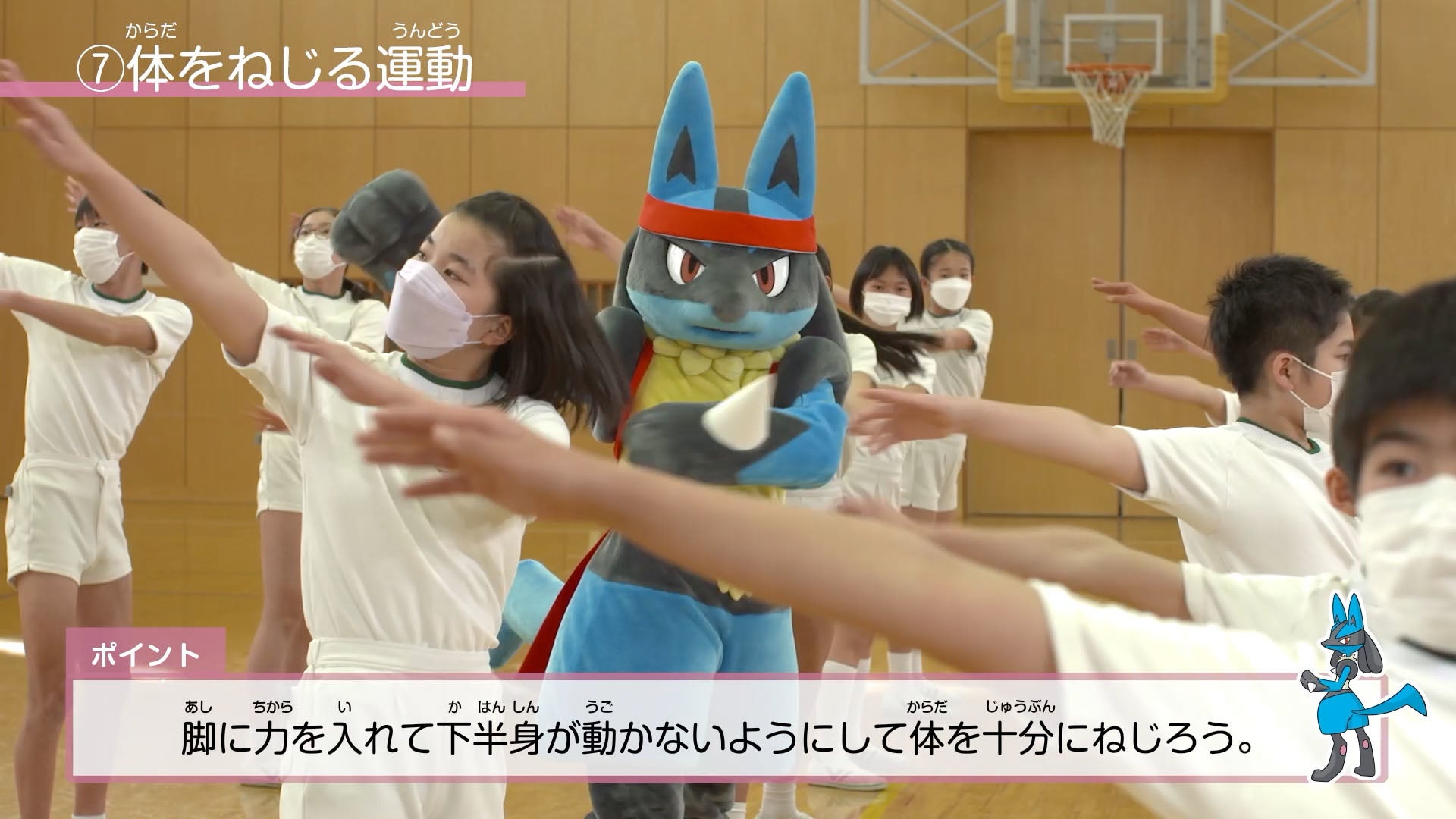 青山学院初等部ではプレイルーム(体育館)に入ると、バスケットボールをしていた児童たちが突然のルカリオの登場に驚き、駆け寄ります。そのあと、ルカリオと子どもたちは一緒に元気よく、清々しくラジオ体操を行いました。
